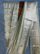 This semi tissue organza Banarasi saree features a light green colour with gold stripes and patterns throughout the fabric. The saree has a subtle yet elegant design with gold accents adding a touch of sophistication. The semi tissue organza material gives the saree a lightweight and airy feel. The saree showcases traditional Banarasi craftsmanship with its intricate gold patterns.The saree comes with attached self color blouse piece.