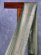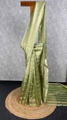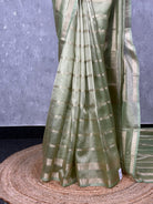 This semi tissue organza Banarasi saree features a green colour with gold stripes and patterns throughout the fabric. The saree has a subtle yet elegant design with gold accents adding a touch of sophistication. The semi tissue organza material gives the saree a lightweight and airy feel. The saree showcases traditional Banarasi craftsmanship with its intricate gold patterns.The saree comes with attached self color blouse piece.