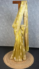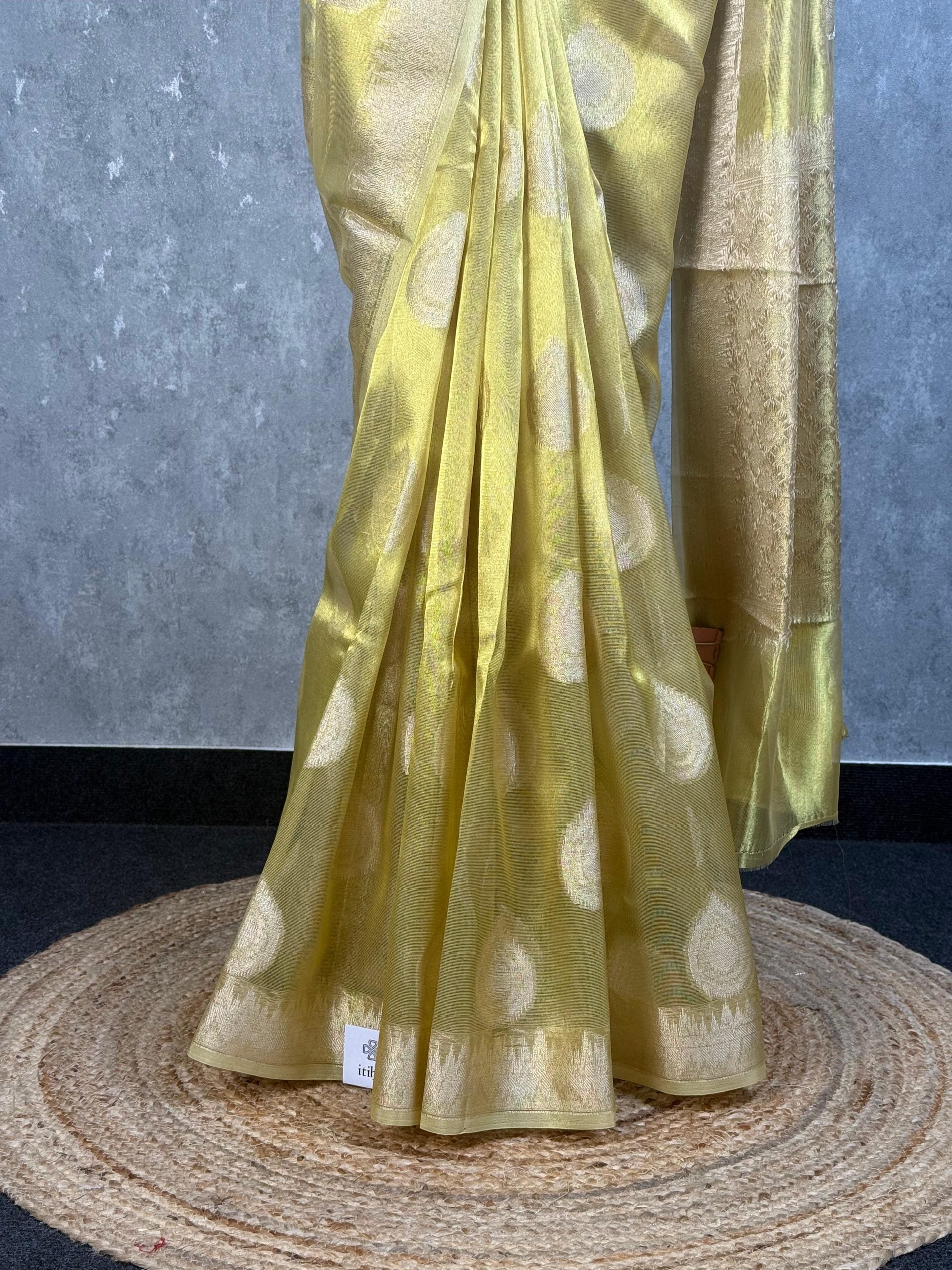 This semi tissue organza Banarasi saree features a soft yellow colour with gold polka dot patterns. The saree showcases a blend of tissue organza fabric with intricate gold designs. It has a subtle sheen that adds to its elegance. The saree is adorned with gold accents throughout, enhancing its traditional Banarasi appeal.The saree comes with attached self color blouse piece.
