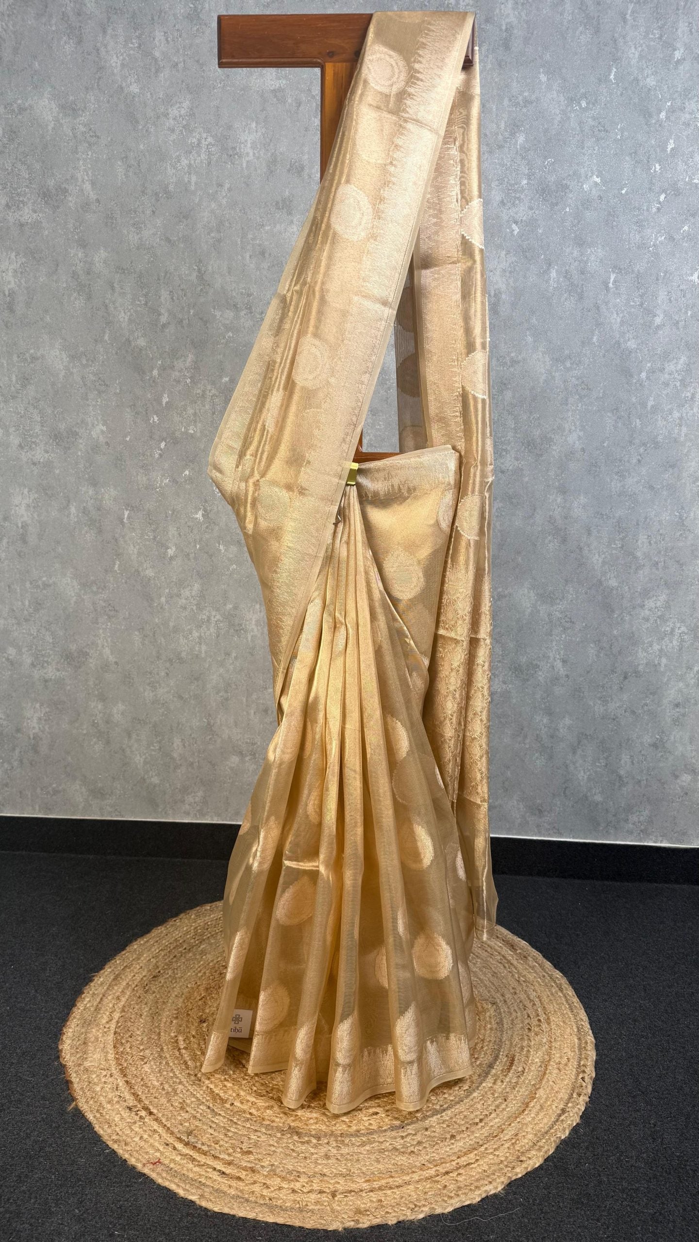 This semi tissue organza Banarasi saree features a soft gold colour with gold polka dot patterns. The saree showcases a blend of tissue organza fabric with intricate gold designs. It has a subtle sheen that adds to its elegance. The saree is adorned with gold accents throughout, enhancing its traditional Banarasi appeal.The saree comes with attached self color blouse piece.