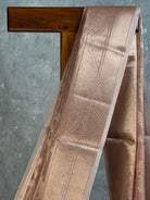 This semi tissue organza Jaal Banarasi saree features a peach colour with intricate gold zari patterns throughout. The saree has a gold border that adds a touch of elegance. The fabric showcases a beautiful Jaal pattern with gold accents. The saree is adorned with gold zari work, giving it a luxurious look.The saree comes with attached self color blouse piece.