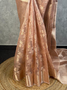 This semi tissue organza Jaal Banarasi saree features a peach colour with intricate gold patterns woven throughout. The saree has a gold border that adds to its elegance. The fabric showcases a jaal pattern, characteristic of Banarasi sarees, with delicate gold motifs. The saree is complemented by a matching gold-pattered piece, likely the pallu.The saree comes with attached self color blouse piece.