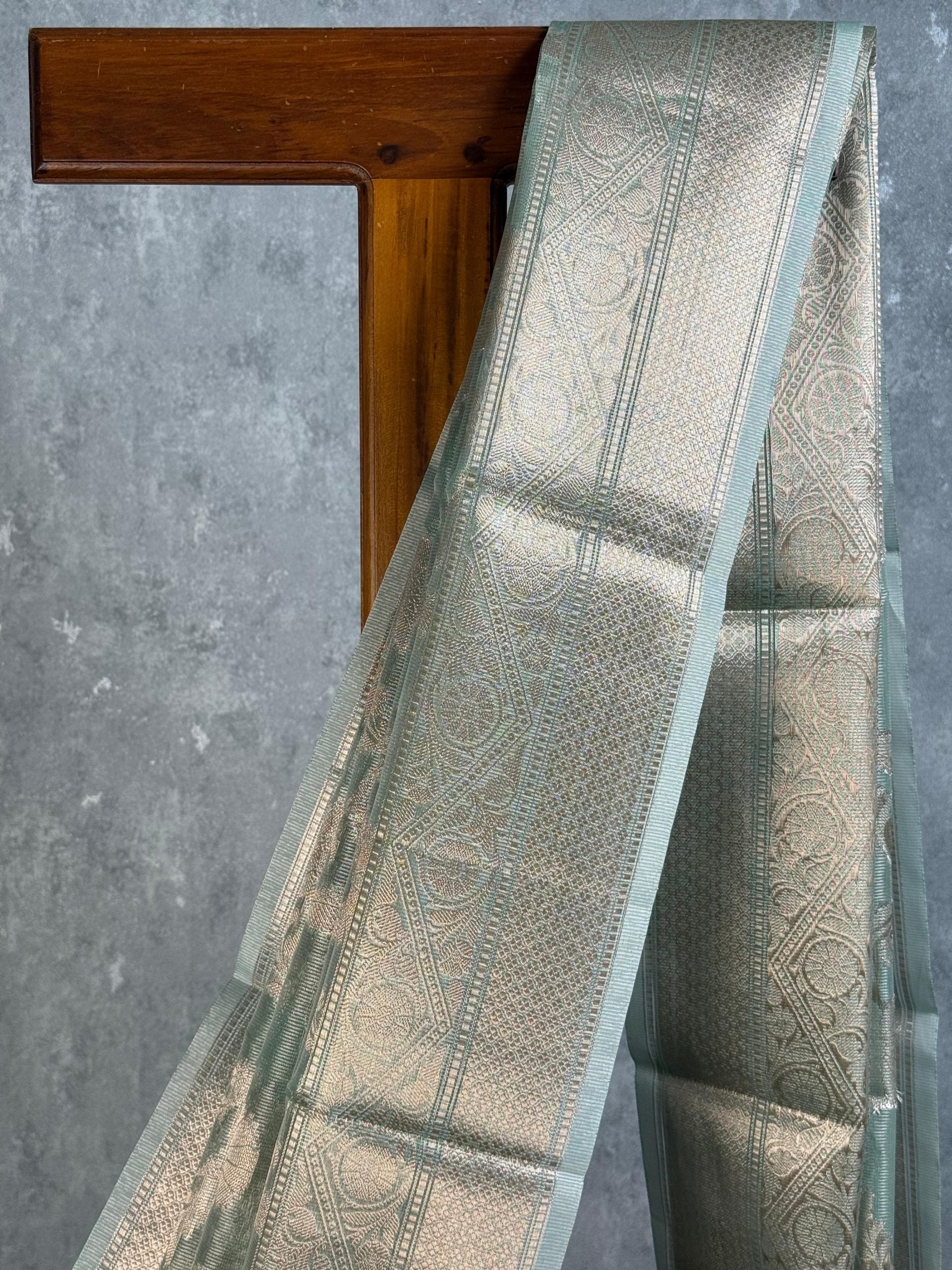 This semi tissue organza Jaal Banarasi saree features a light blue colour with intricate gold zari patterns throughout. The saree has a gold border that adds a touch of elegance. The fabric showcases a beautiful Jaal pattern with gold accents. The saree is adorned with gold zari work, giving it a luxurious look.The saree comes with attached self color blouse piece.
