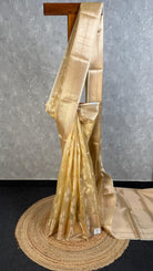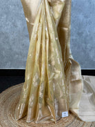 This semi tissue organza Jaal Banarasi saree features a gold colour with intricate gold zari patterns throughout. The saree has a gold border that adds a touch of elegance. The fabric showcases a beautiful Jaal pattern with gold accents. The saree is adorned with gold zari work, giving it a luxurious look.The saree comes with attached self color blouse piece.