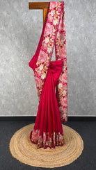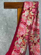 This semi Tussar cutwork embroidery saree is a stunning rani pink and floral masterpiece. The saree features intricate cutwork embroidery with a beautiful floral pattern in shades of pink, orange, and green on a teal blue background. The contrast between the delicate floral design and the solid black fabric creates a striking visual effect. The saree’s elegant design makes it perfect for formal occasions. The saree comes with attached blouse piece.