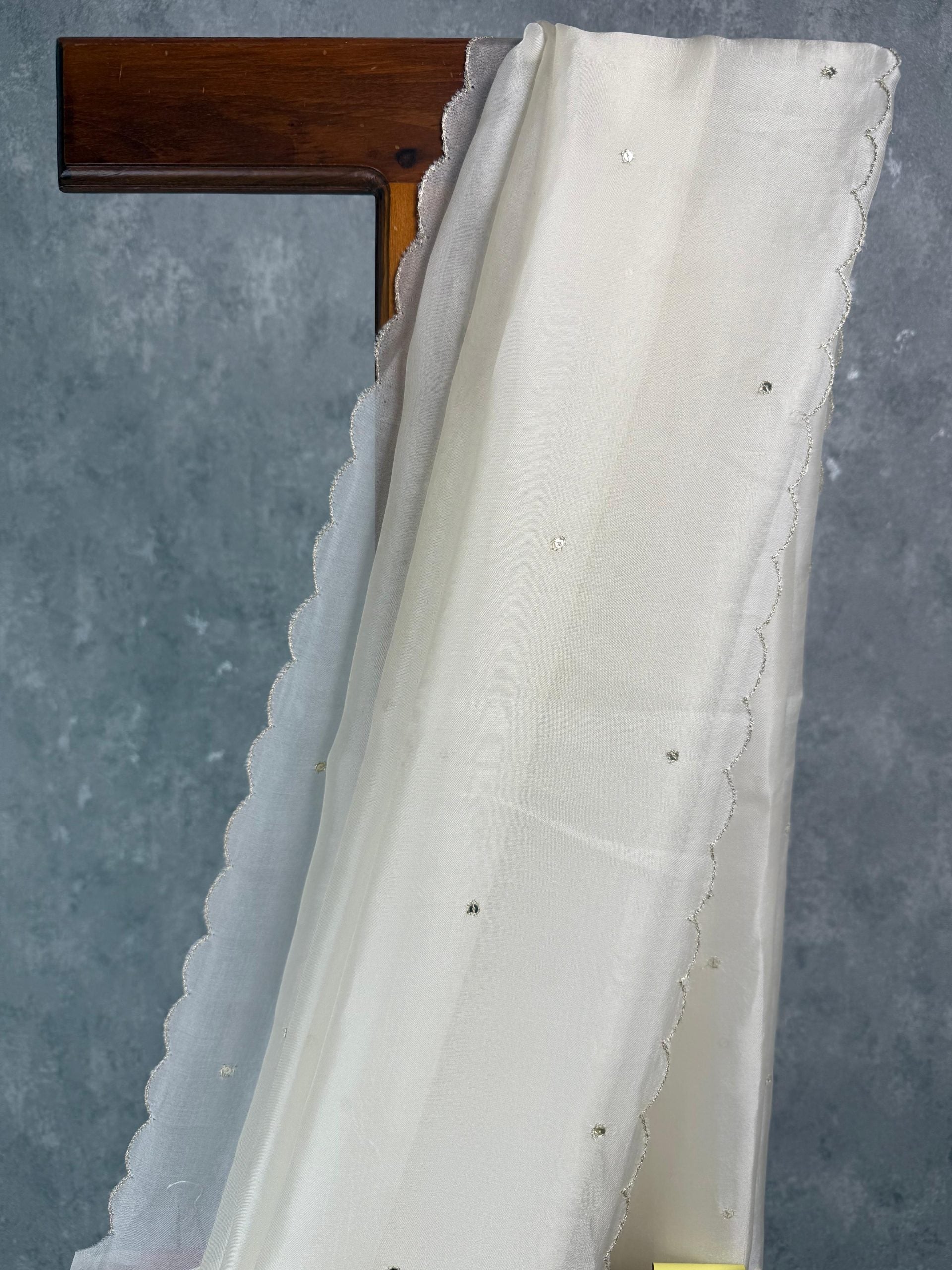 This is an elegant ivory white silk organza saree featuring delicate silver sequin embroidery and scalloped edges. It has a soft, lightweight texture that drapes beautifully. The saree comes with a vibrant floral-printed blouse in shades of yellow, peach, powder blue, and pink.