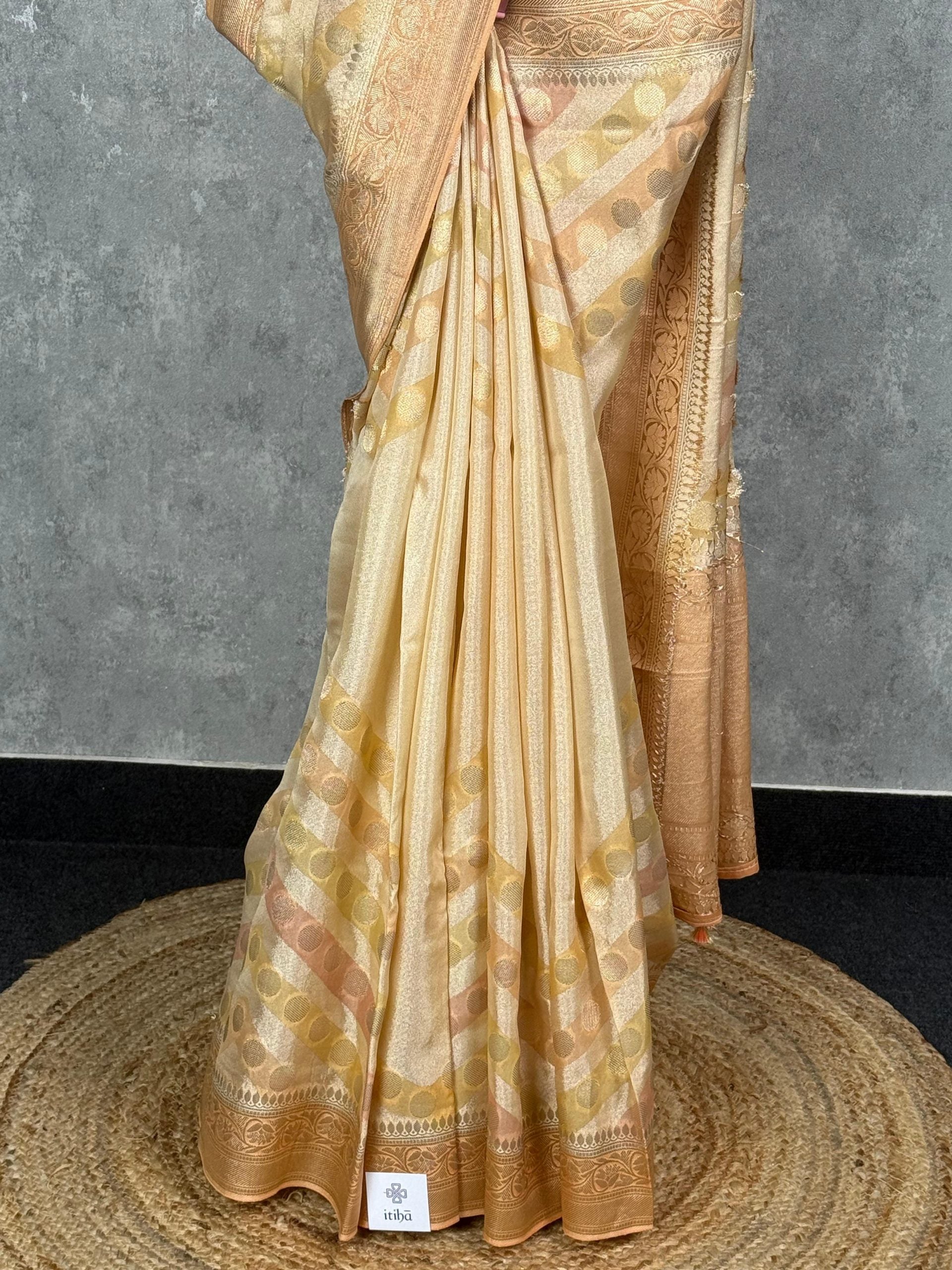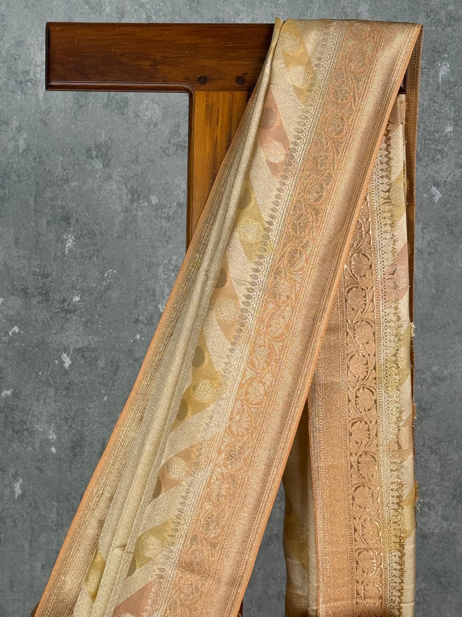 This stunning Banarasi saree features a soft cream base enhanced with a warm copper-gold tissue finish. The intricate zari weaving and delicate pastel patterns exude timeless elegance and charm. Ideal for festive celebrations or grand occasions, it beautifully captures the essence of traditional Banarasi craftsmanship.