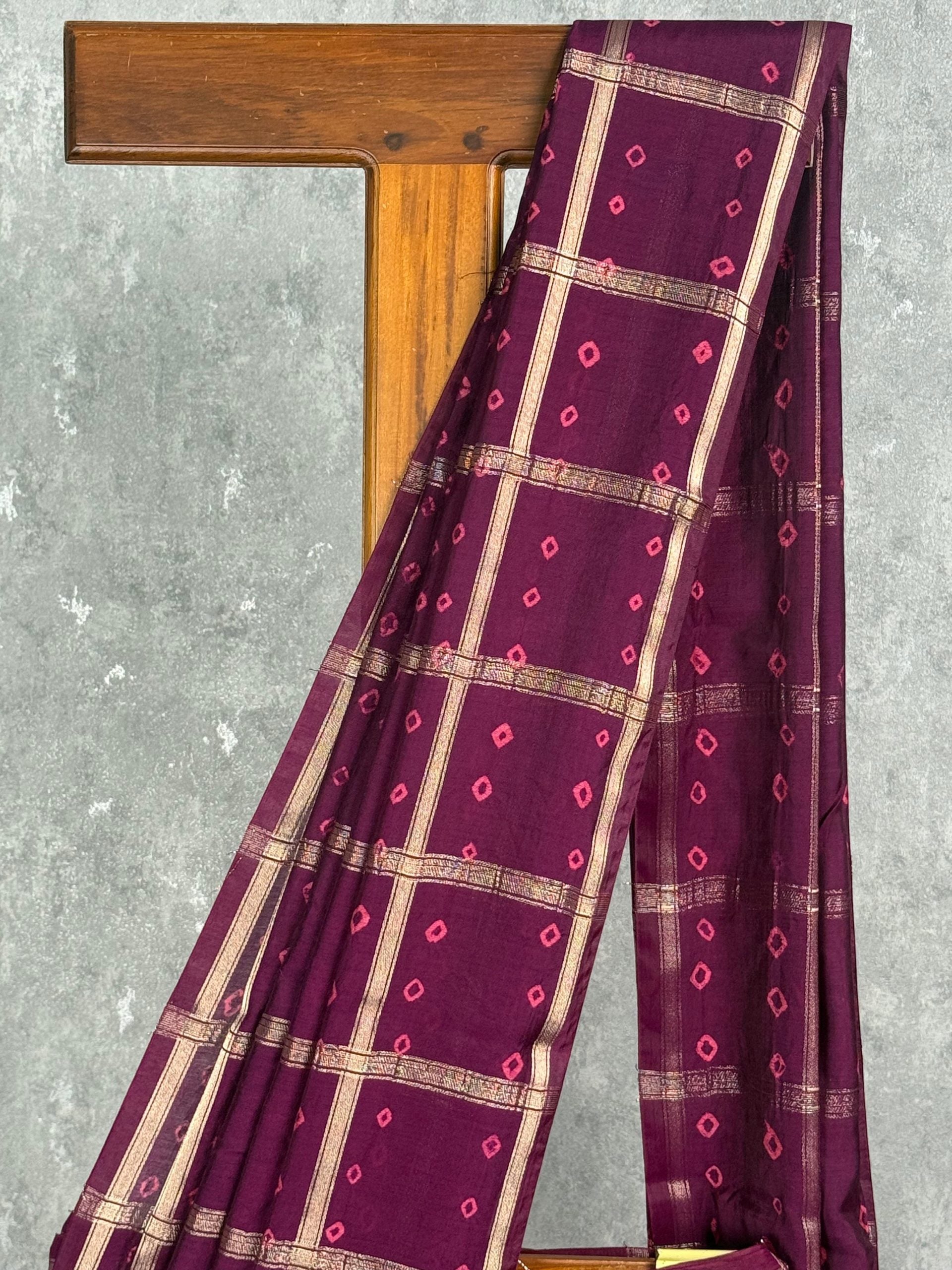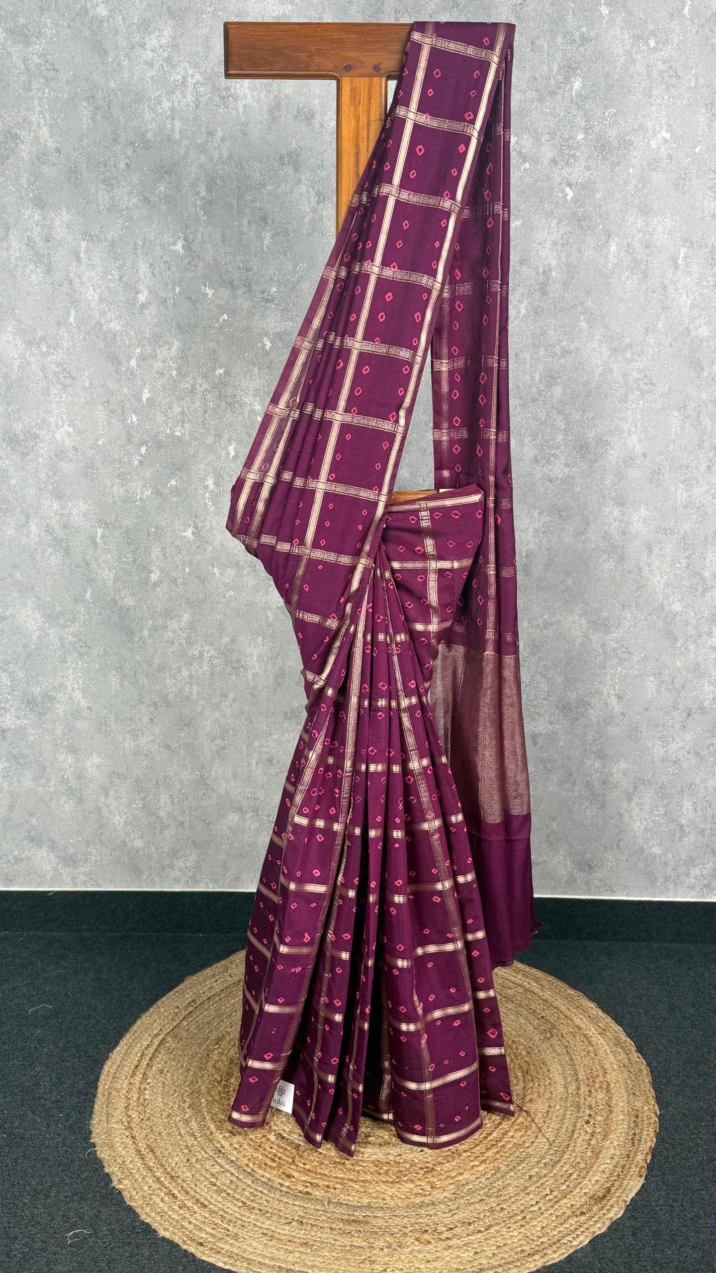 This saree exudes timeless elegance with its rich plum hue, enhanced by delicate golden checks and charming small motifs. The combination of vibrant colour and traditional detailing creates a sophisticated, festive look. Its graceful drape makes it perfect for celebrations and special occasions.