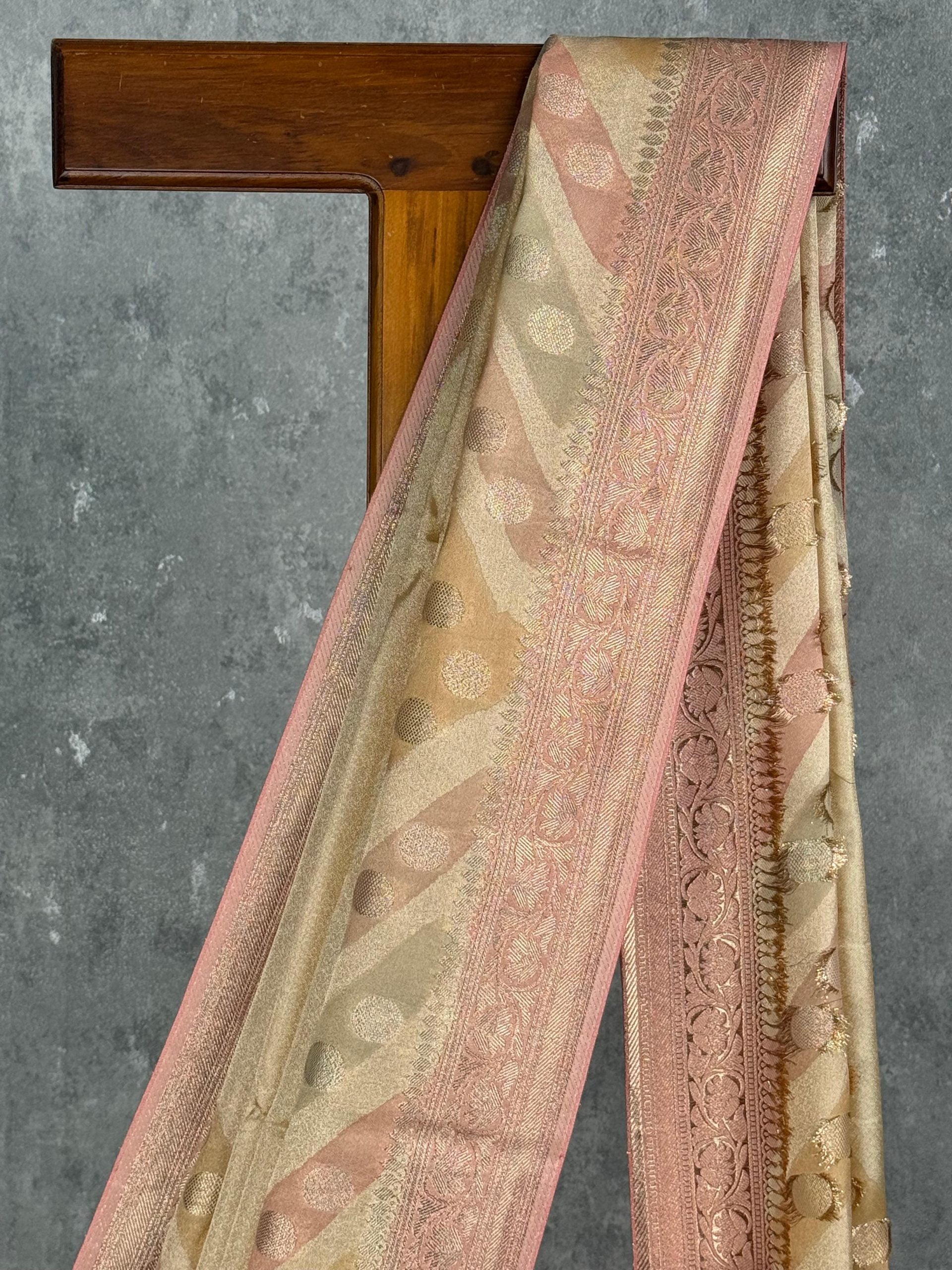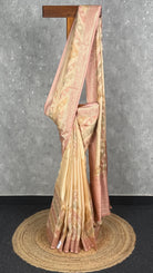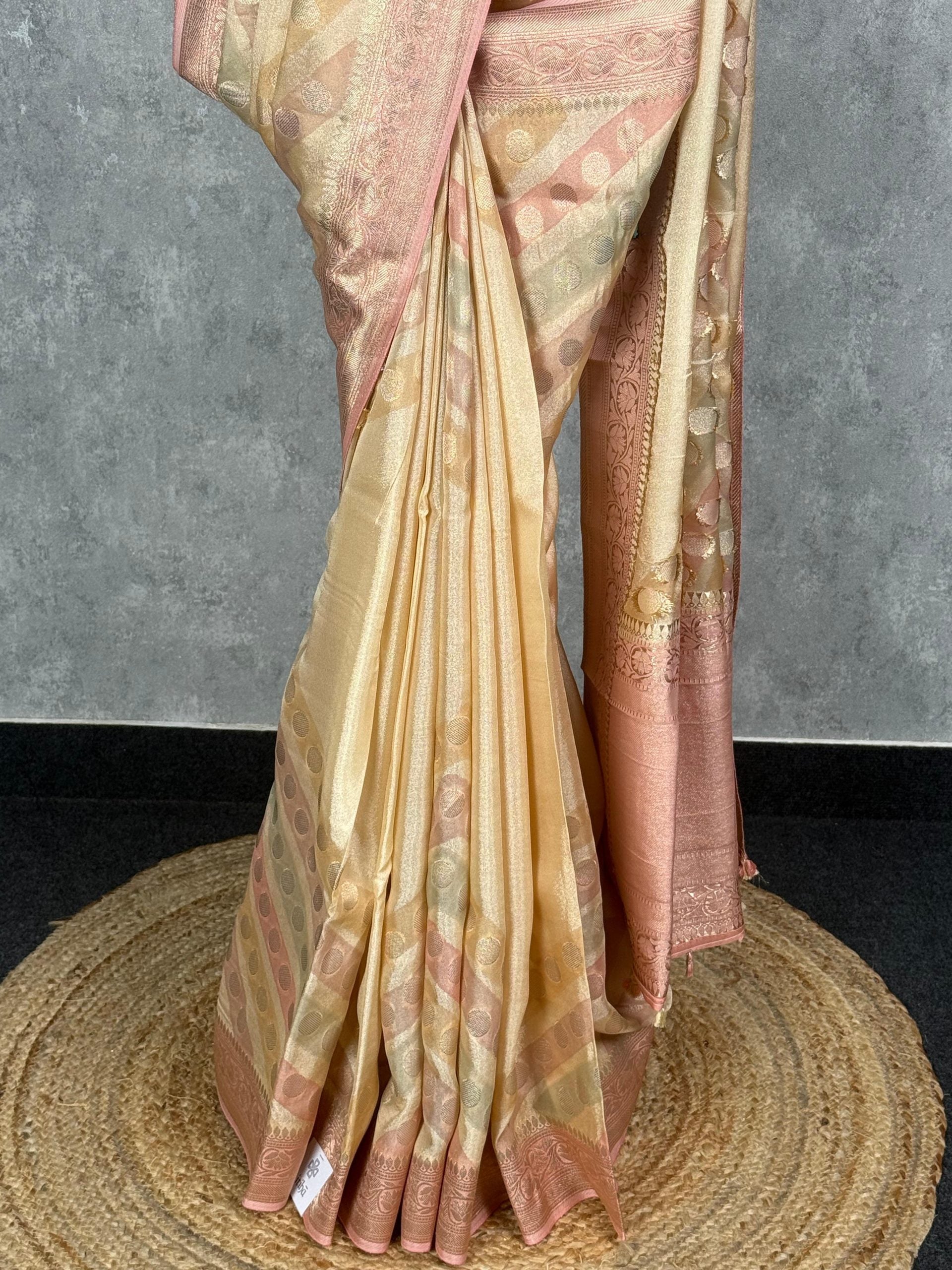 This elegant Banarasi saree features a soft cream base with a rich golden tissue finish. Adorned with intricate zari detailing and subtle pastel patterns, it radiates refined sophistication. Perfect for weddings or festive occasions, this saree beautifully blends tradition with graceful luxury.
