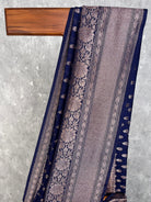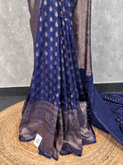 This stunning Semi Georgette Antique Zari Banarasi Saree comes in a vibrant Royal Blue shade, admired with intricate antique gold zari weavings. The saree comes with attached self color blouse piece.