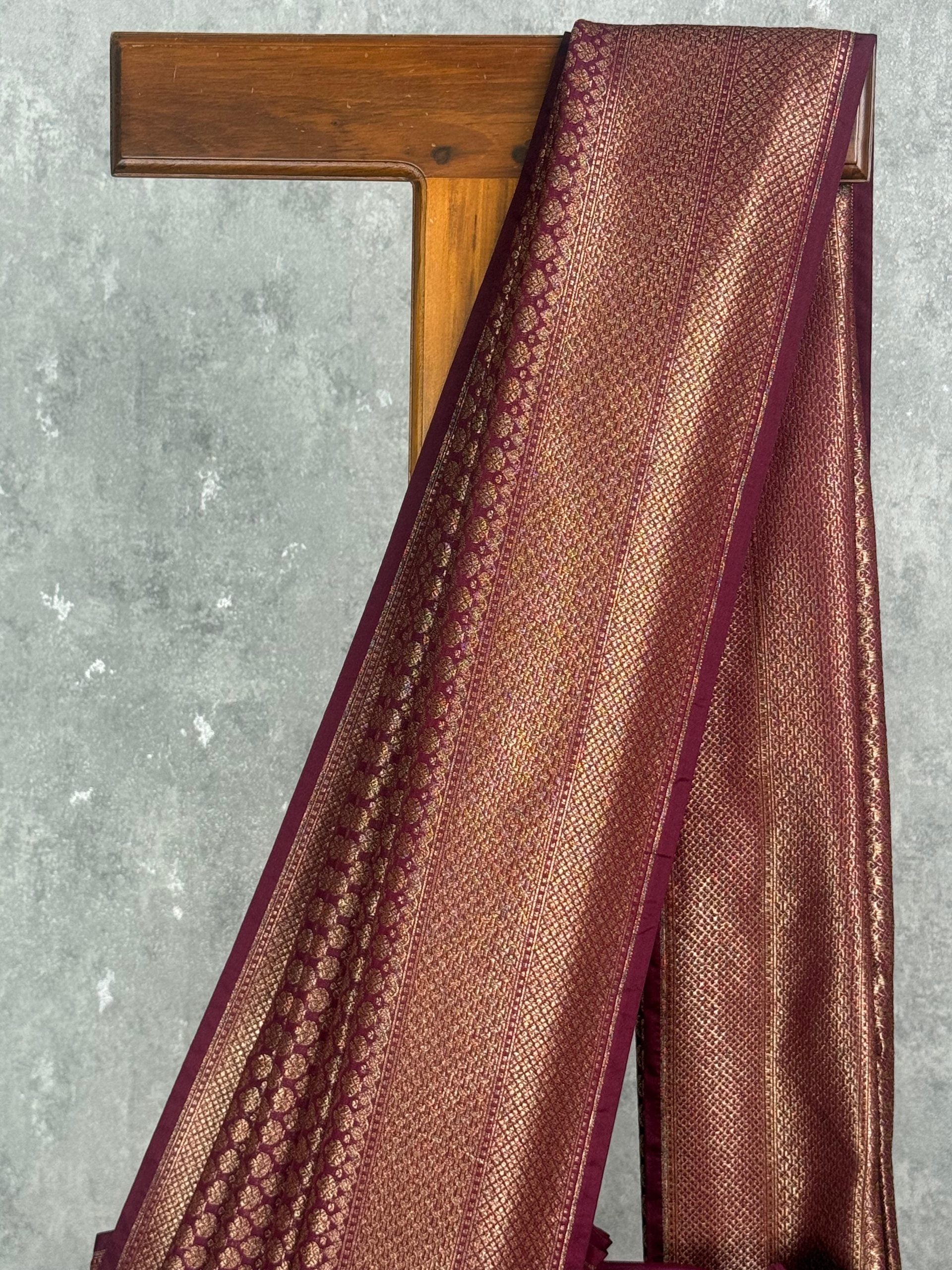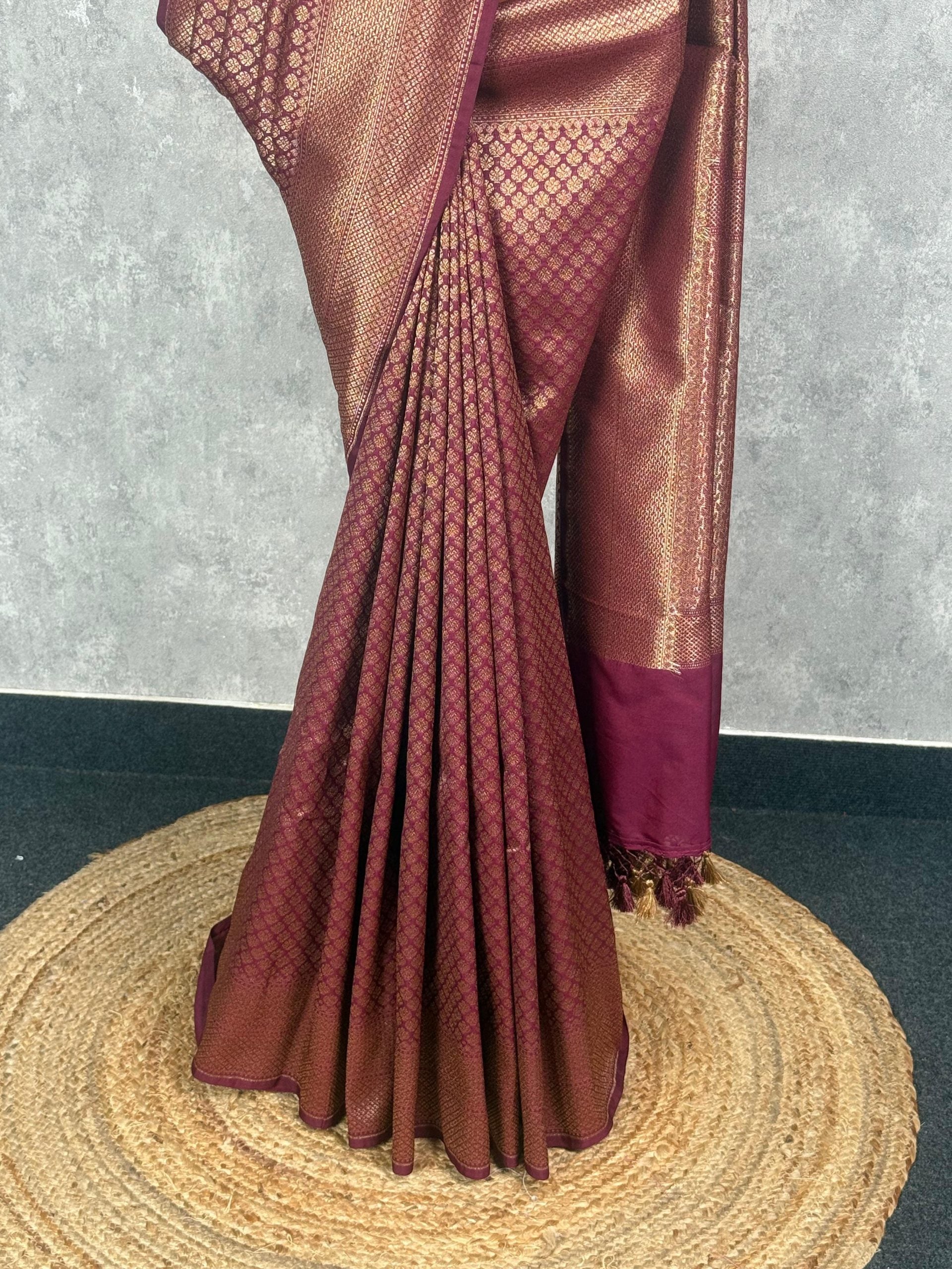 This saree exudes regal elegance with its rich maroon hue beautifully complemented by intricate gold zari weaving. The detailed patterns add depth and sophistication, giving it a timeless traditional charm. Perfect for grand occasions, it delivers a bold yet graceful statement.