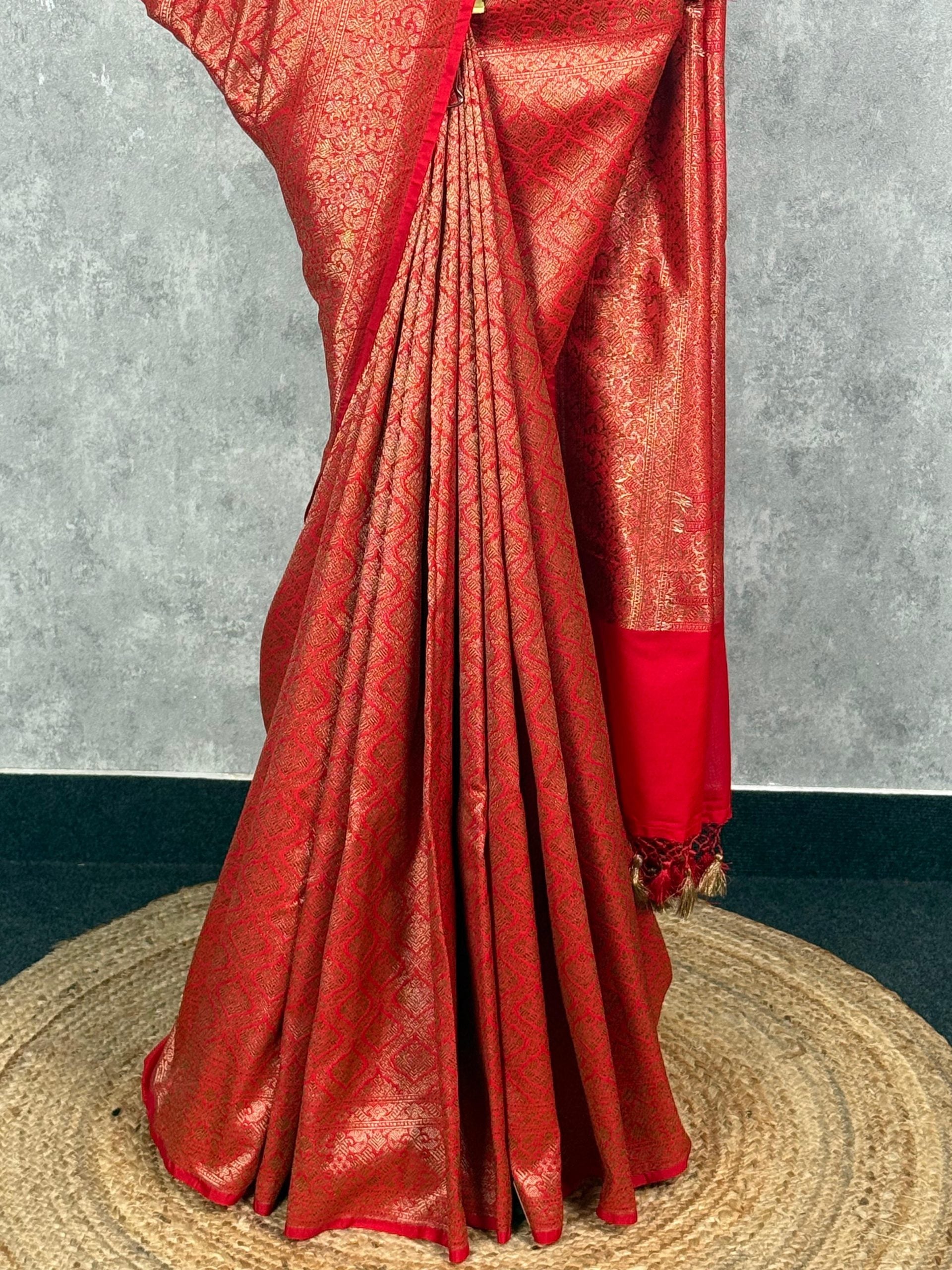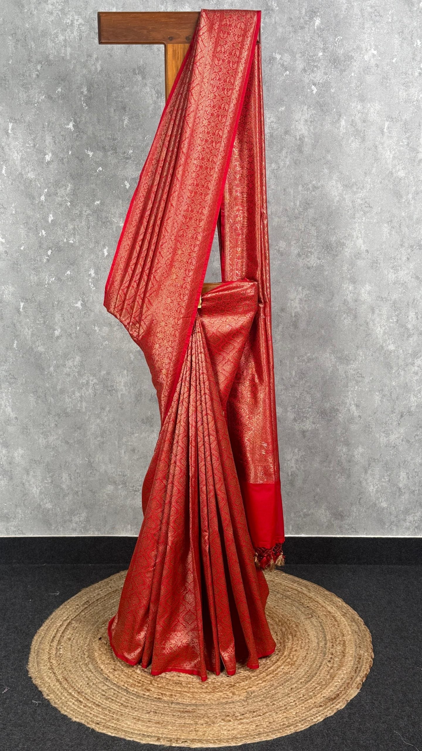 This saree dazzles with its vibrant red hue, enriched by intricate golden zari work that exudes pure traditional elegance. The detailed weaving and luxurious pallu make it a standout choice for weddings and festive occasions. Its rich texture and timeless charm create a graceful and regal presence.