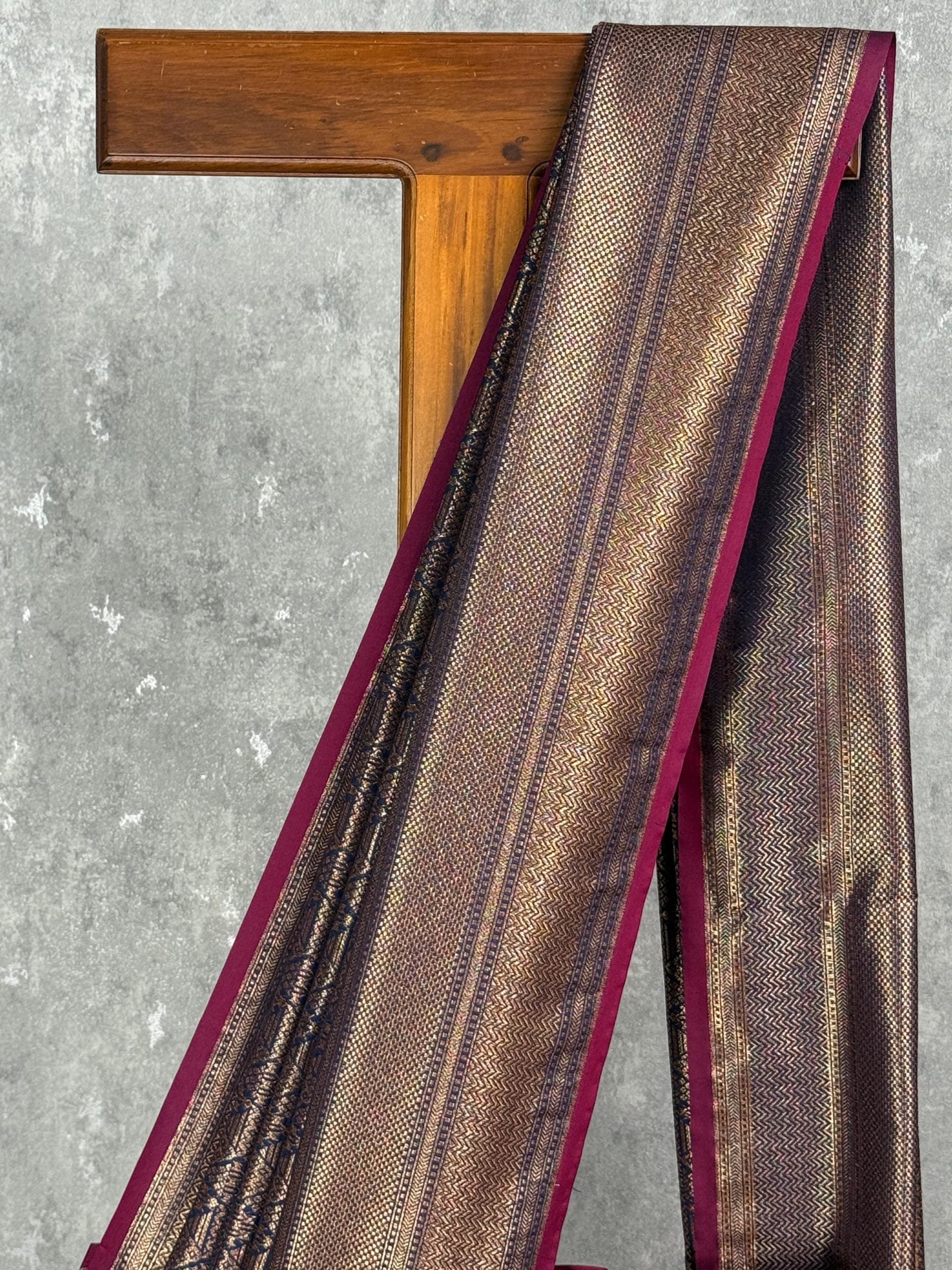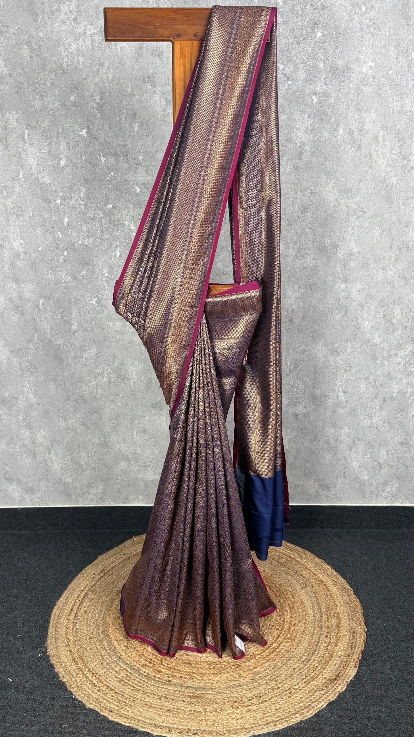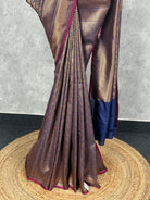 This stunning saree features a rich blend of deep purple and antique gold, creating a luxurious and regal appeal. Intricate woven patterns enhance its grandeur, while the contrasting navy-blue pallu adds a bold finishing touch. Perfect for weddings and festive occasions, it exudes timeless elegance.