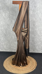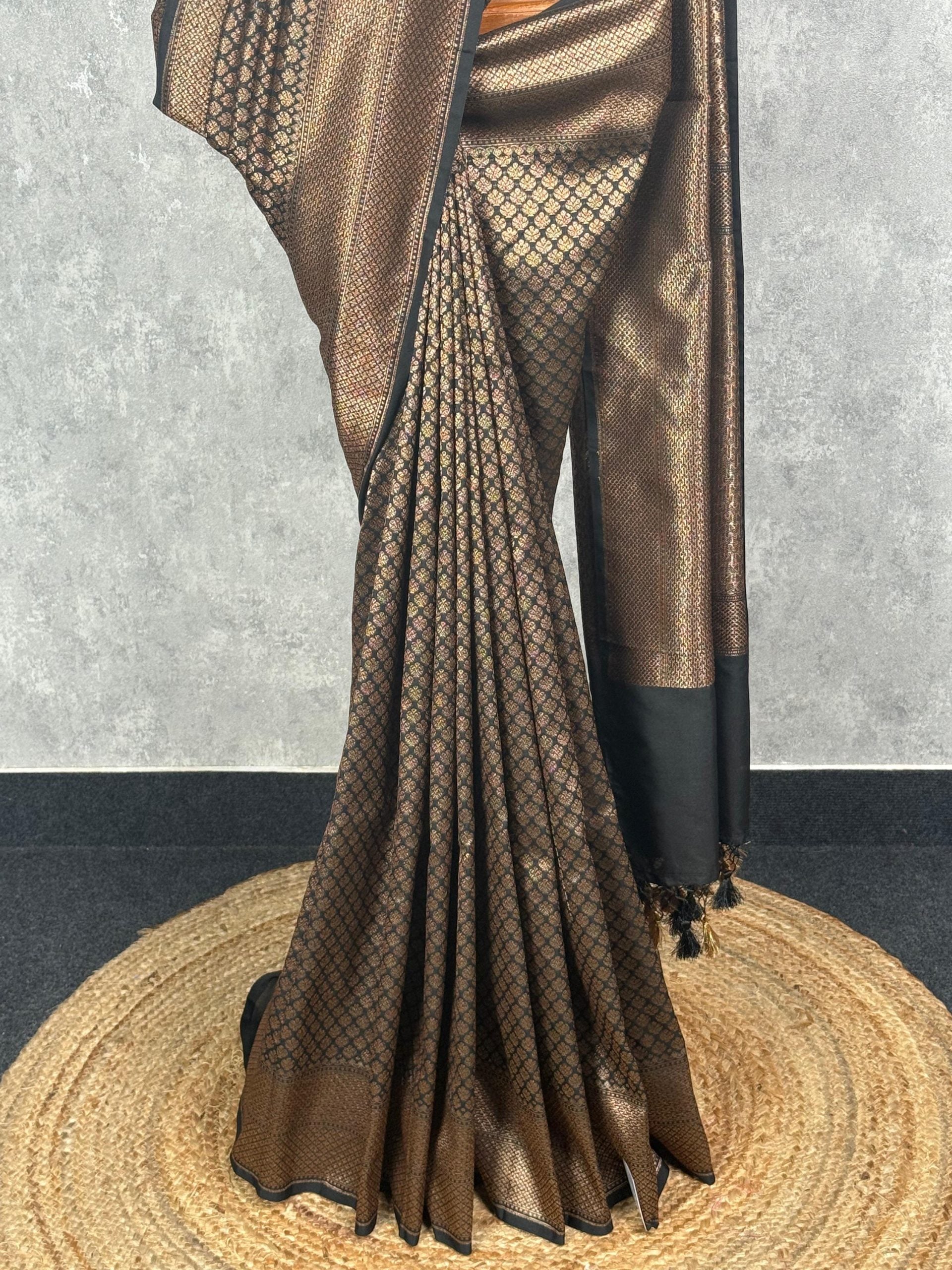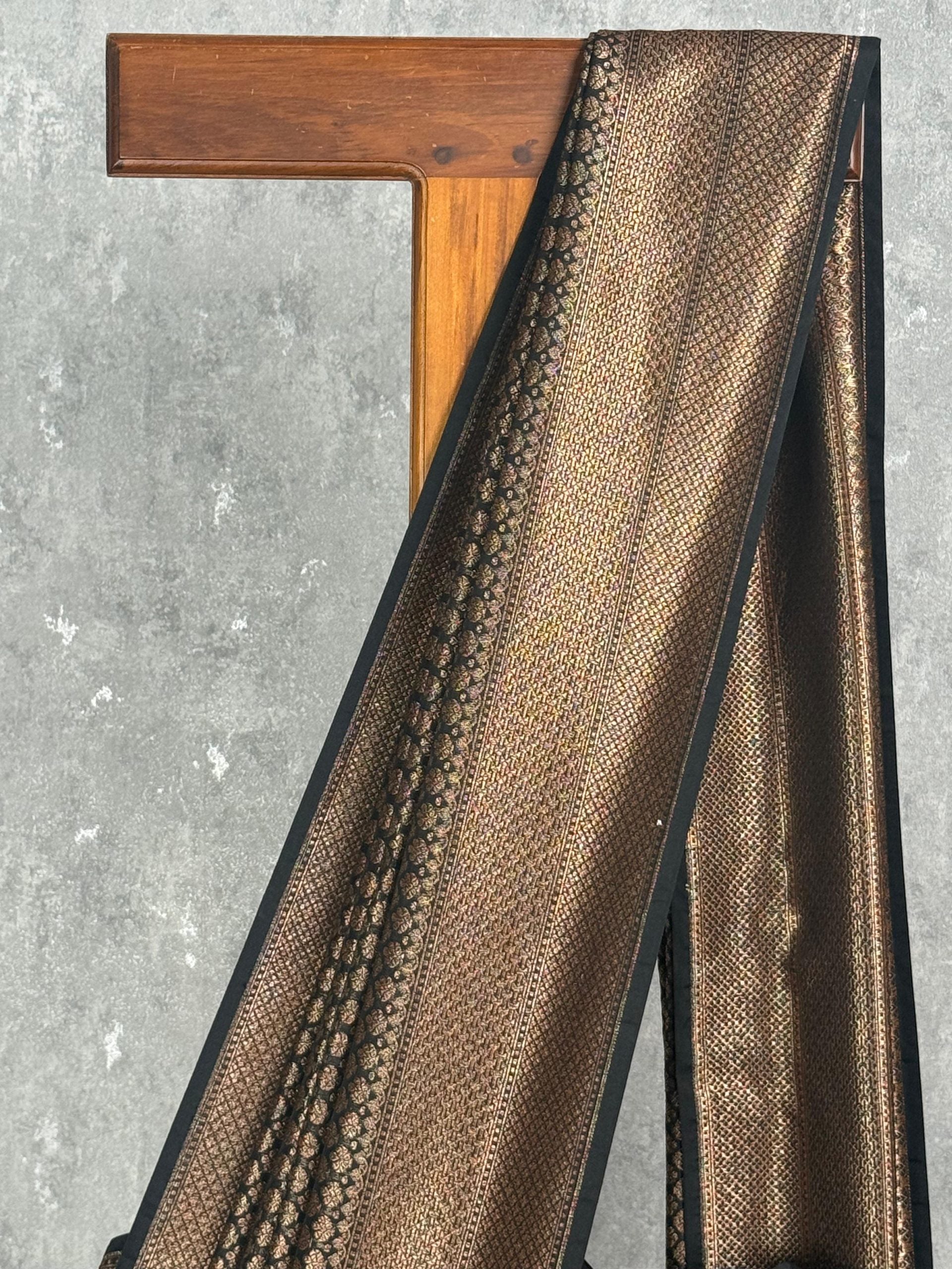 This saree exudes a rich, regal charm with its deep bronze-gold body enhanced by intricate woven detailing. The subtle black accents along the border add a refined contrast, elevating its sophisticated appeal. Perfect for grand occasions, it beautifully blends traditional elegance with a modern, luxurious finish.