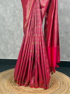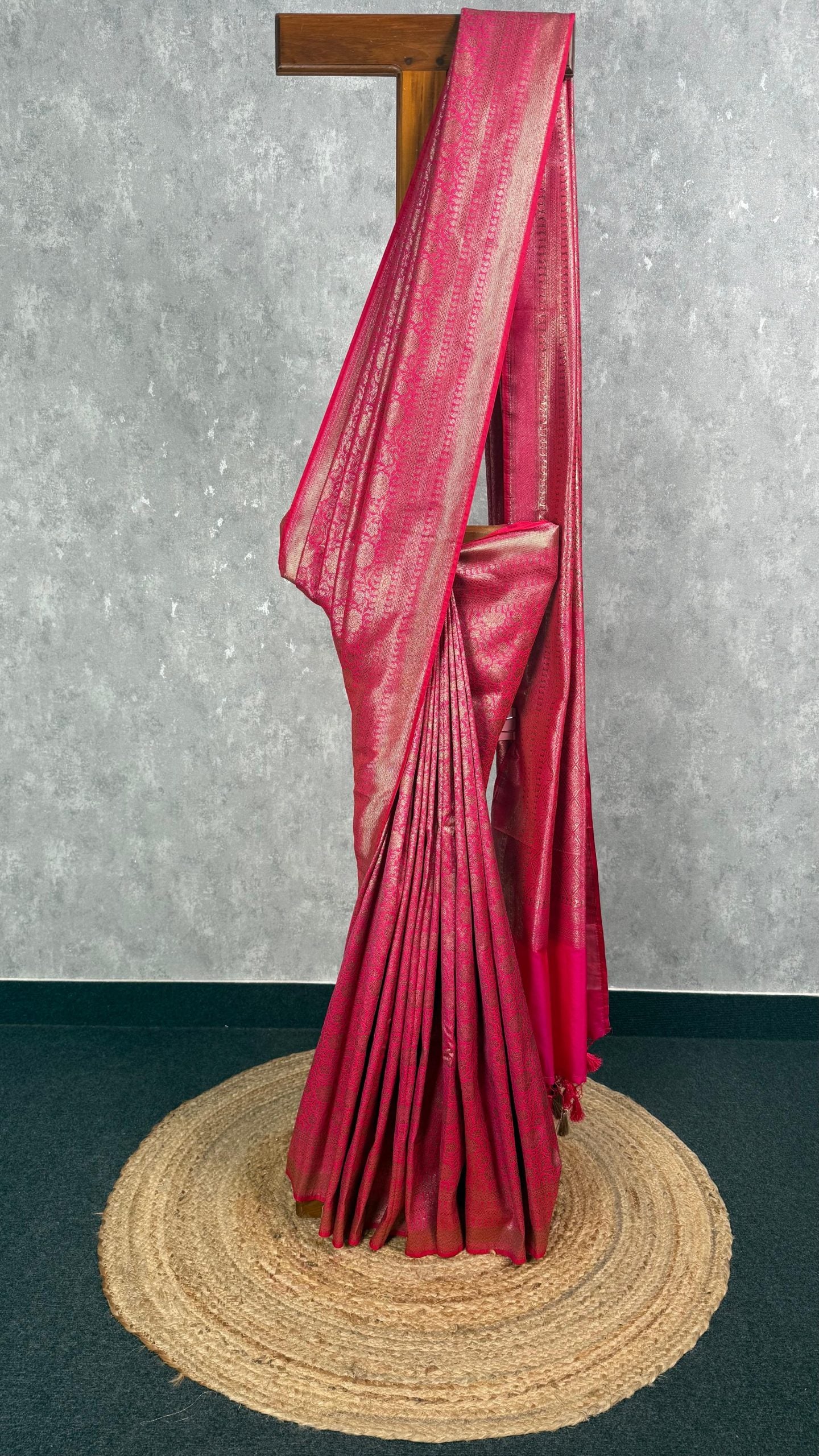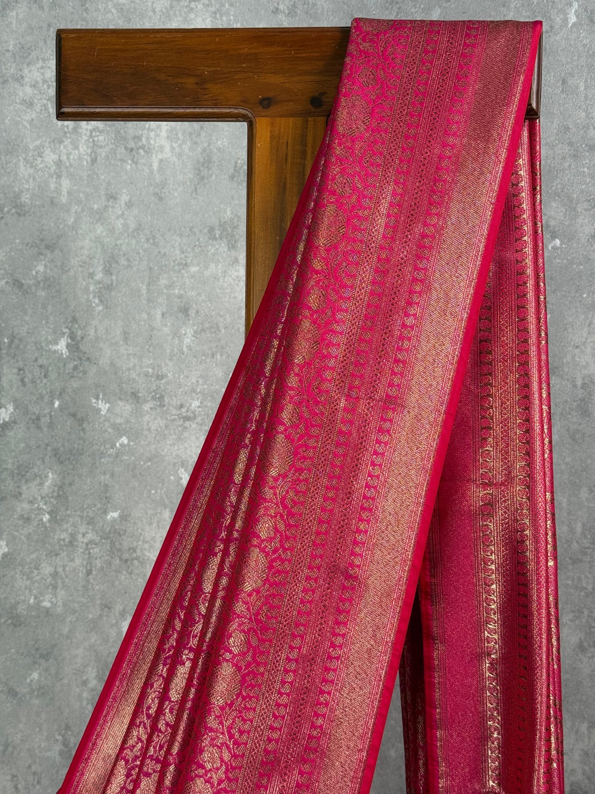 This semi Katan antique zari brocade Banarasi saree features a vibrant rani pink colour with intricate gold zari patterns woven throughout. The saree showcases a rich brocade texture, adding to its traditional charm. The antique zari work gives the saree a classic and timeless appeal. The saree is adorned with detailed patterns that highlight the craftsmanship of Banarasi weaving. The saree comes with attached self color blouse piece.
