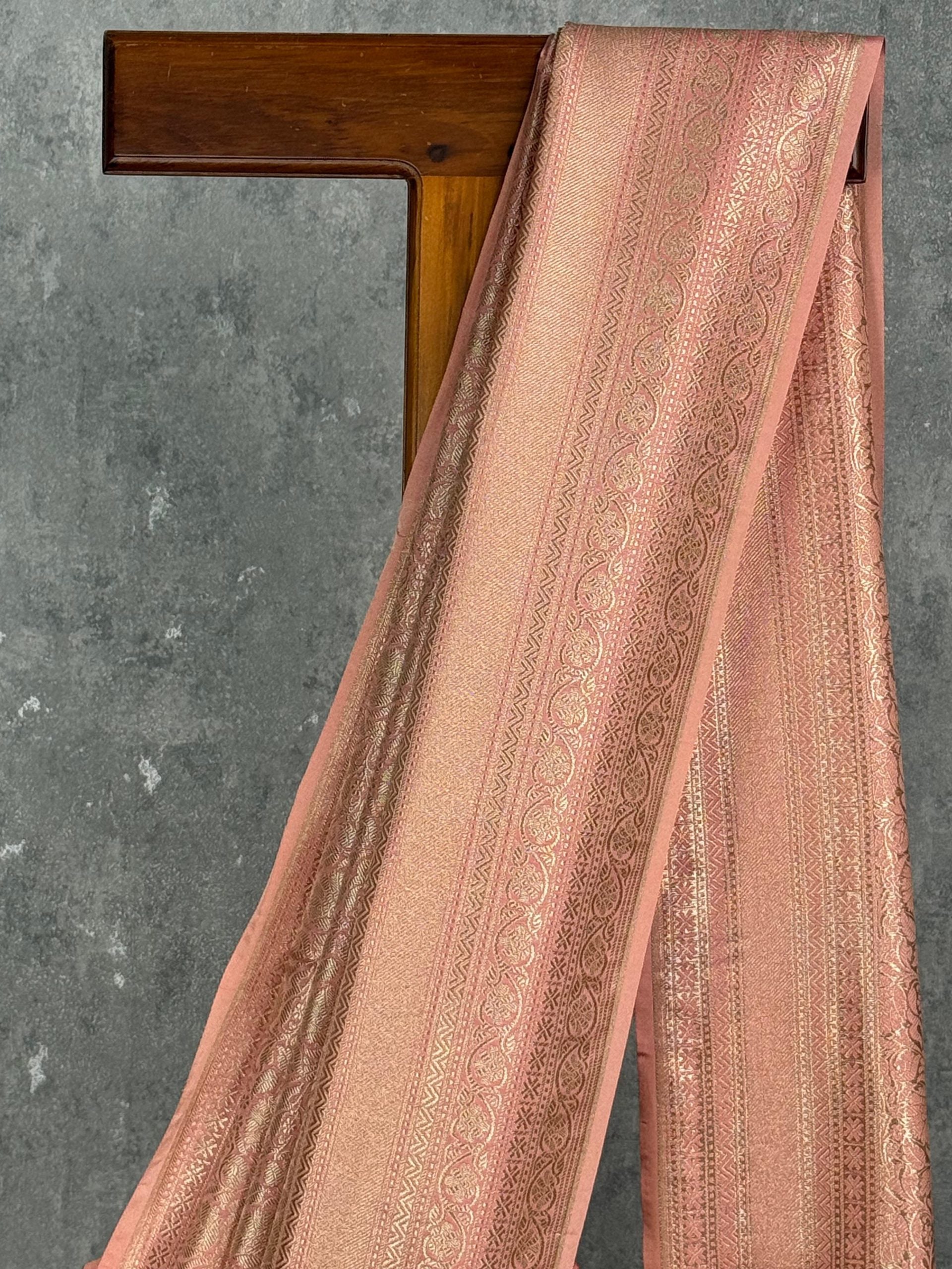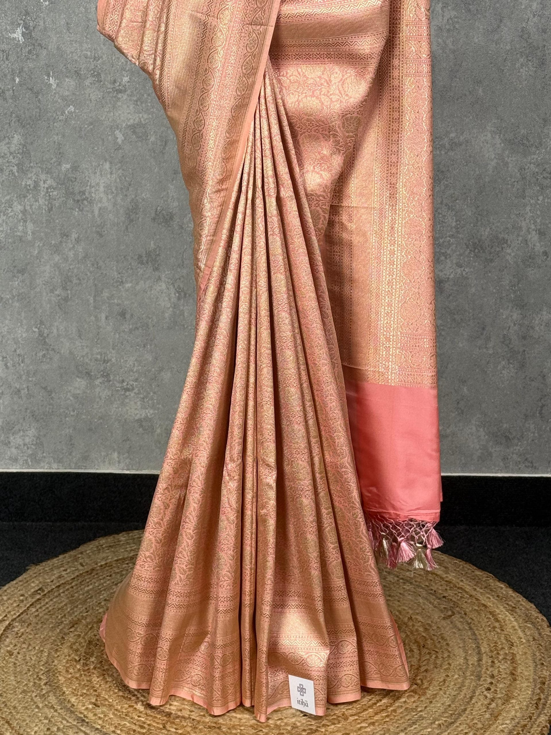 This saree exudes a soft, elegant charm with its peach-pink tone and intricate woven detailing. The subtle sheen of the fabric enhances its richness, while the delicate patterns add a touch of traditional sophistication. Perfect for graceful occasions, it blends timeless craftsmanship with understated beauty.