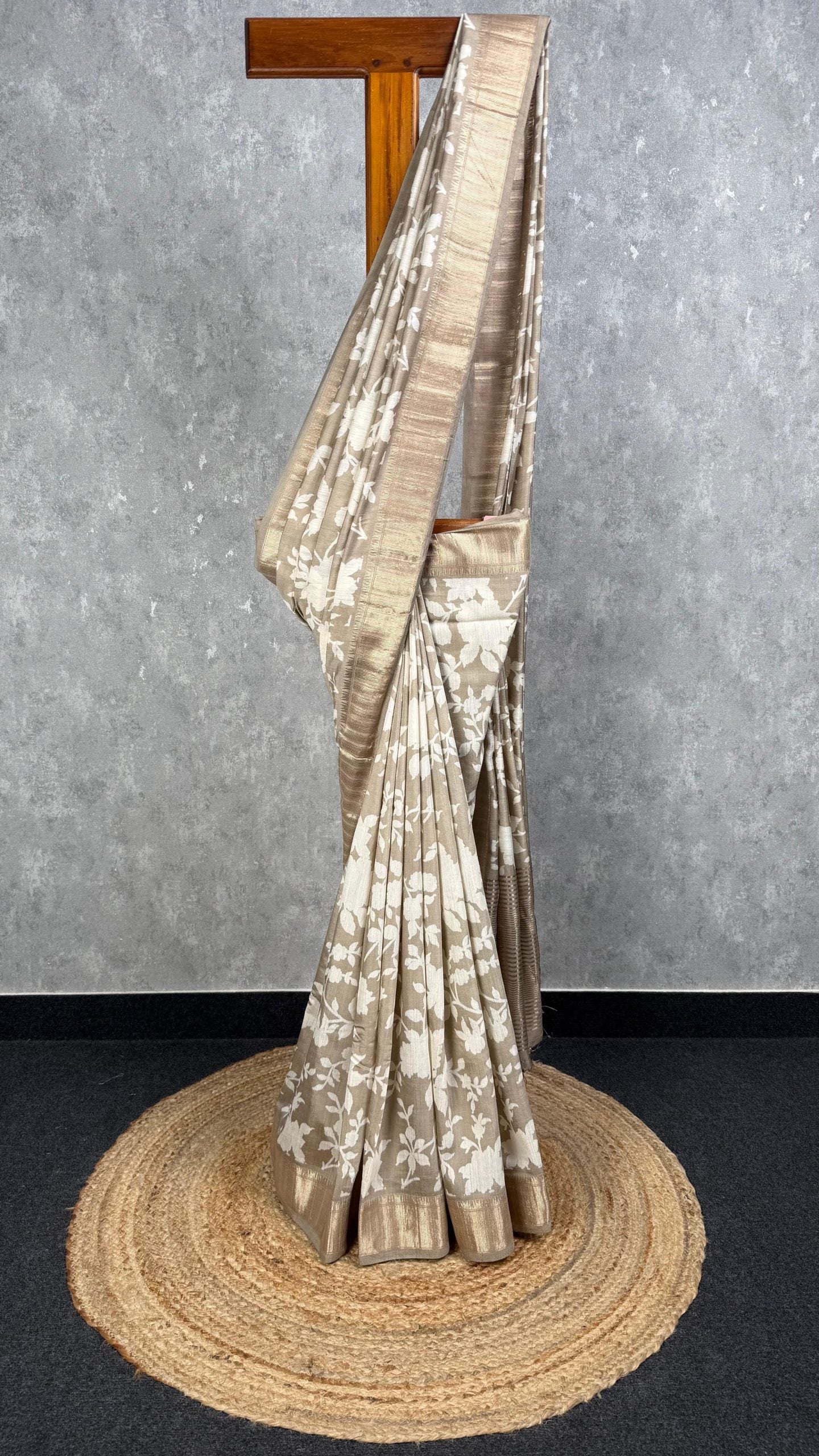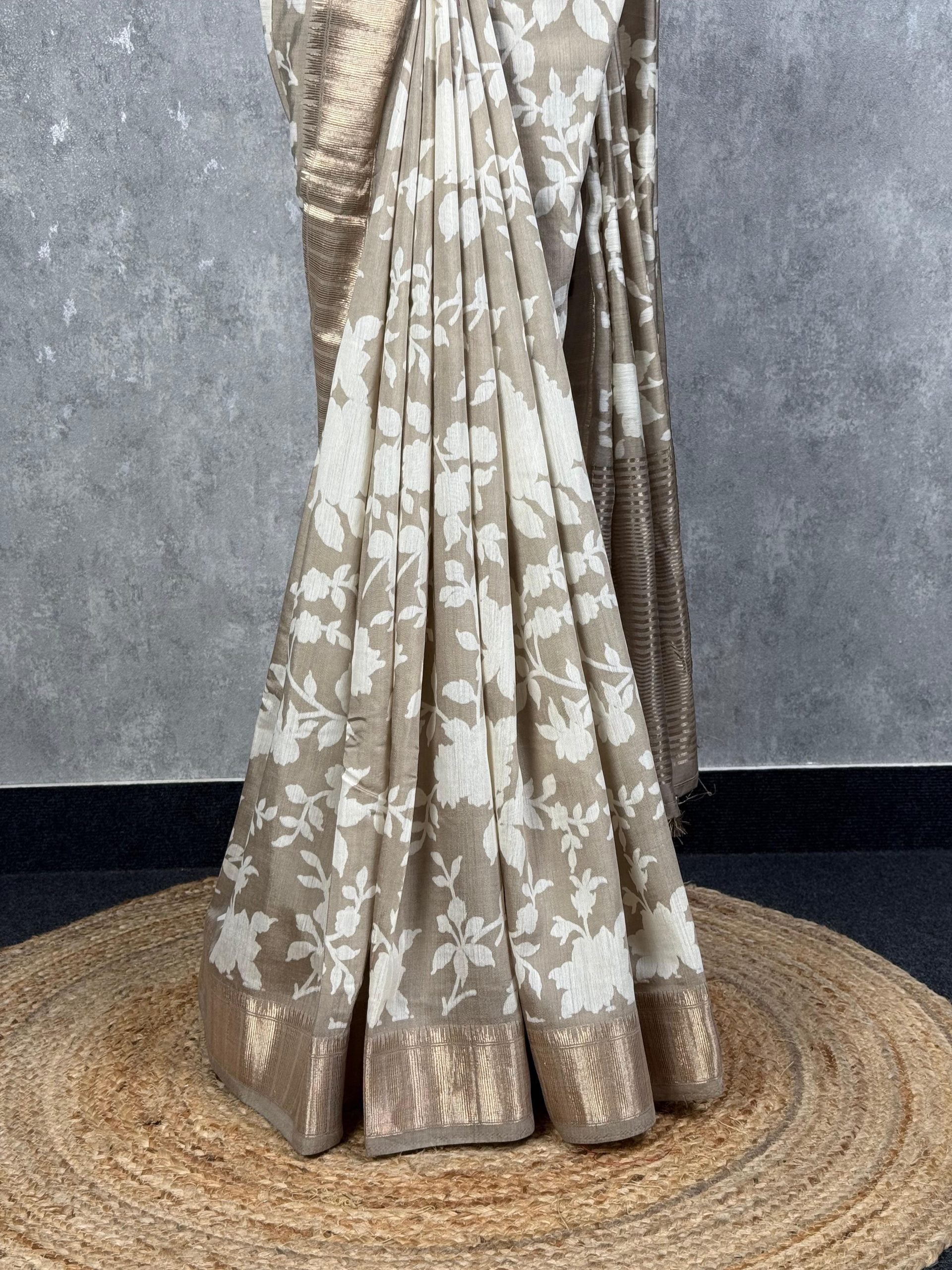 This Assam silk printed Banarasi saree features a beautiful beige colour with a floral pattern in white. The saree has a pink border with a touch of golden accents. The fabric showcases a blend of traditional Banarasi printing techniques with floral motifs. The saree is adorned with elegant detailing through its patterns and colour combination. The saree comes with attached self coloured blouse piece.
