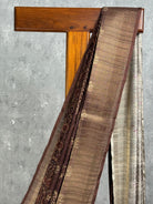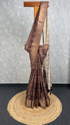 This semi Tussar printed Banarasi saree features intricate floral patterns and a textured fabric that adds depth to the design. The saree has a border that complements the overall pattern. It showcases a blend of traditional Banarasi printing techniques. The saree is in a brown colour. The saree comes with attached self coloured blouse piece.