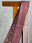 This semi Tussar printed Banarasi saree features intricate floral patterns and a textured fabric that adds depth to the design. The saree has a border that complements the overall pattern. It showcases a blend of traditional Banarasi printing techniques. The saree is in a maroon colour. The saree comes with attached self coloured blouse piece.