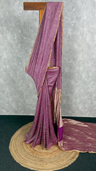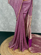 This saree showcases a rich plum-purple shade adorned with elegant golden and silver striped detailing, creating a striking and luxurious look. The shimmering pallu adds a touch of grandeur, perfectly balancing tradition with contemporary elegance. Ideal for festive and special occasions, it drapes beautifully with timeless sophistication.