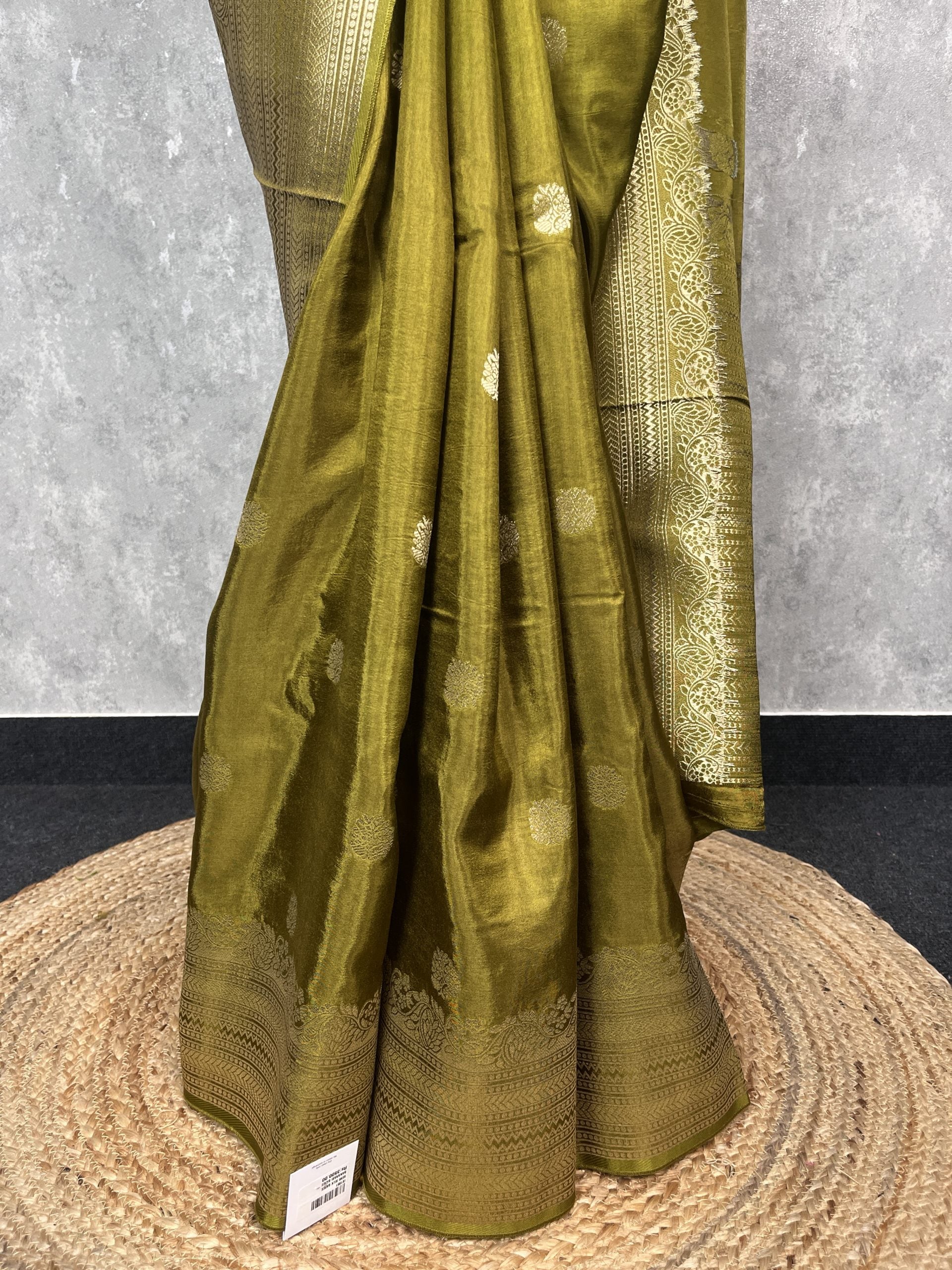 Semi silk saree with light gold zari borders and small bhutas all through the body. The saree comes with self color blouse piece with light gold zari border.