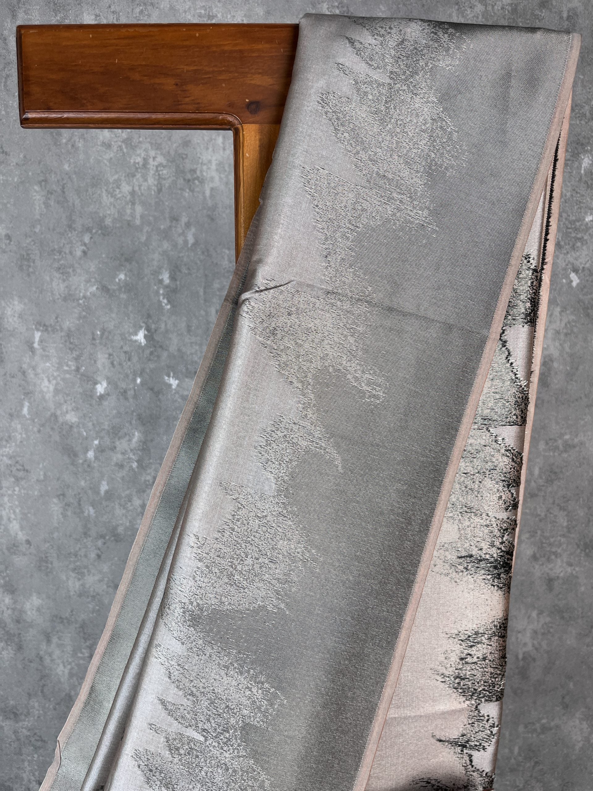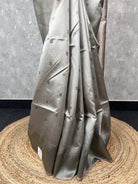 Semi tussar silk Banarasi saree in a soft grey shade, featuring intricate woven motifs and a subtle ombre effect on the boarder. The saree comes with attached blouse piece.