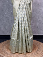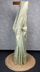 This elegant tissue silk Banarasi saree features a subtle champagne pista green tone with intricate floral brocade weaving throughout the body. The saree comes with attached blouse piece.