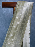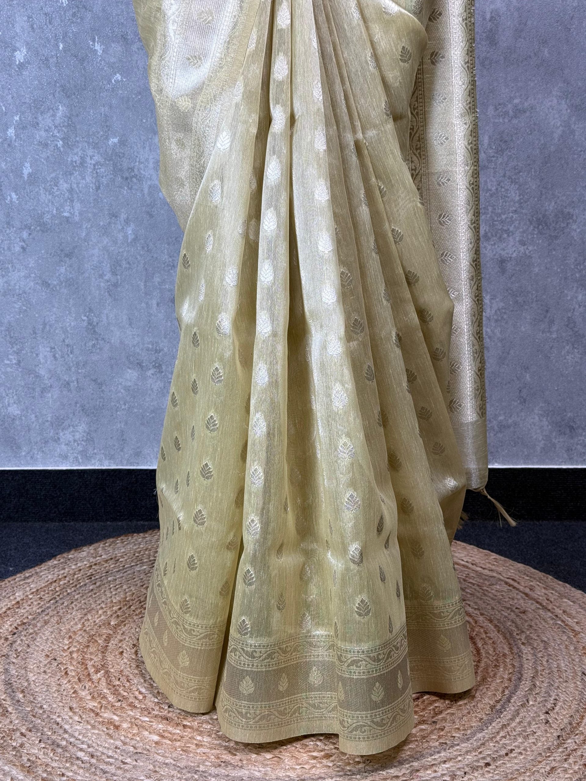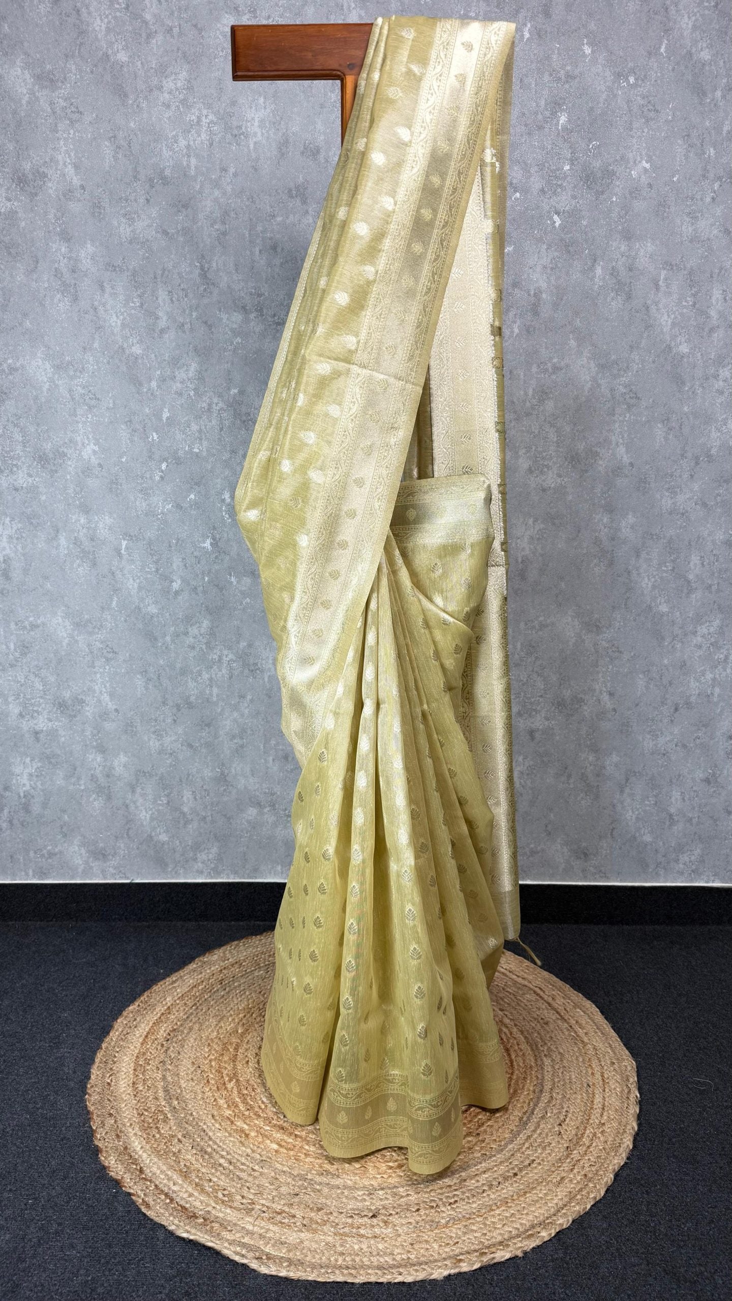 This elegant tissue silk Banarasi saree features a subtle light yellow tone with intricate floral brocade weaving throughout the body. The saree comes with attached blouse piece.