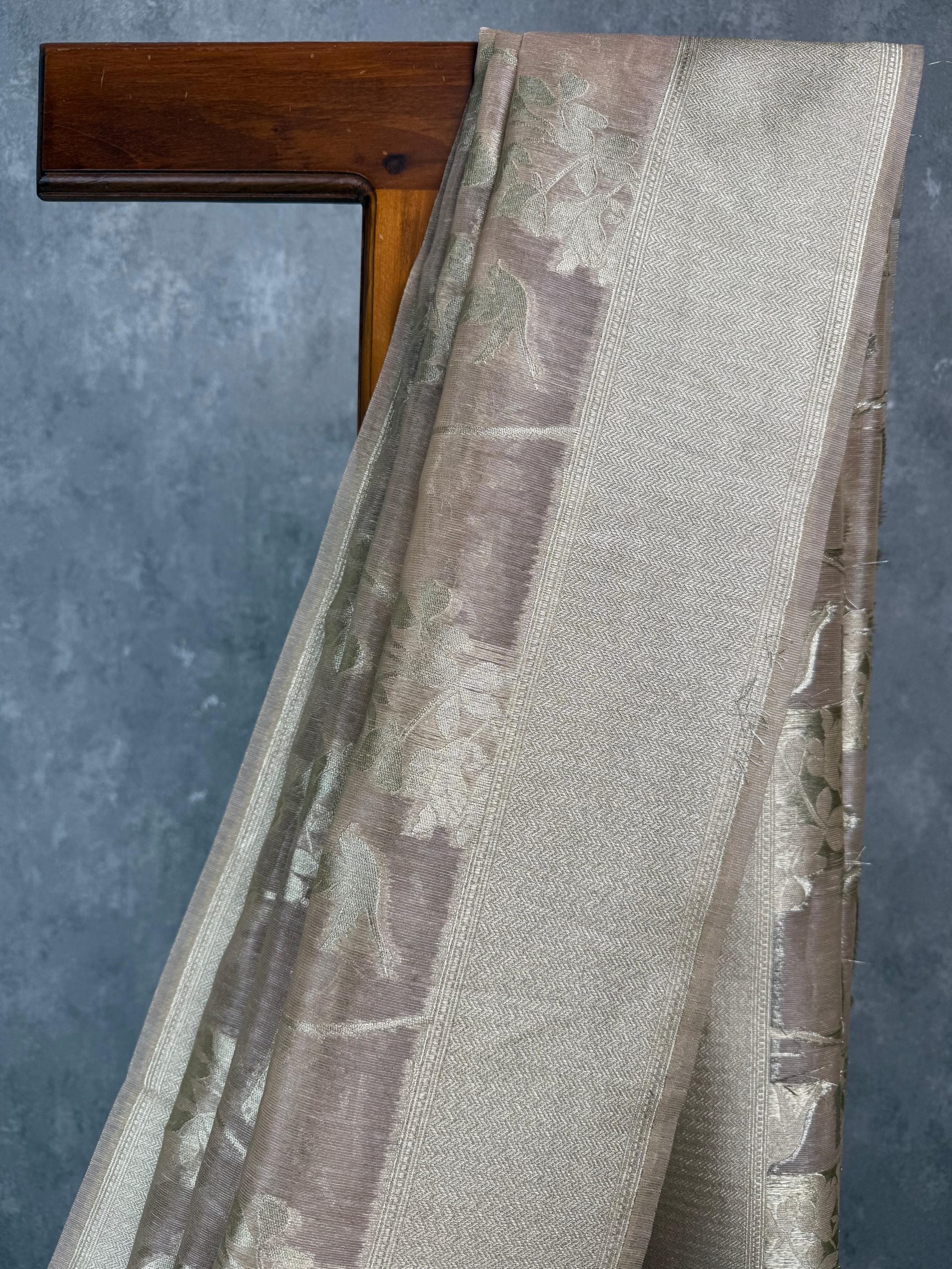 This elegant tissue silk Banarasi saree features a subtle pink tone with intricate floral brocade weaving throughout the body. The saree comes with attached blouse piece.