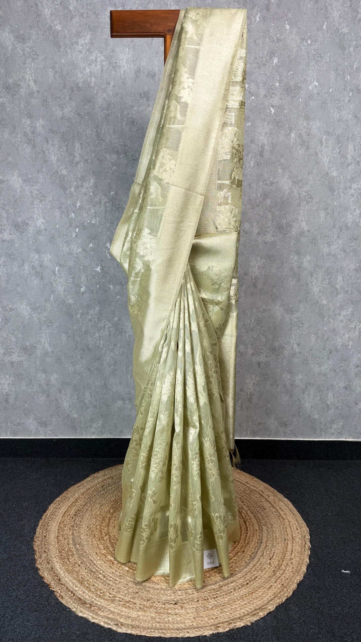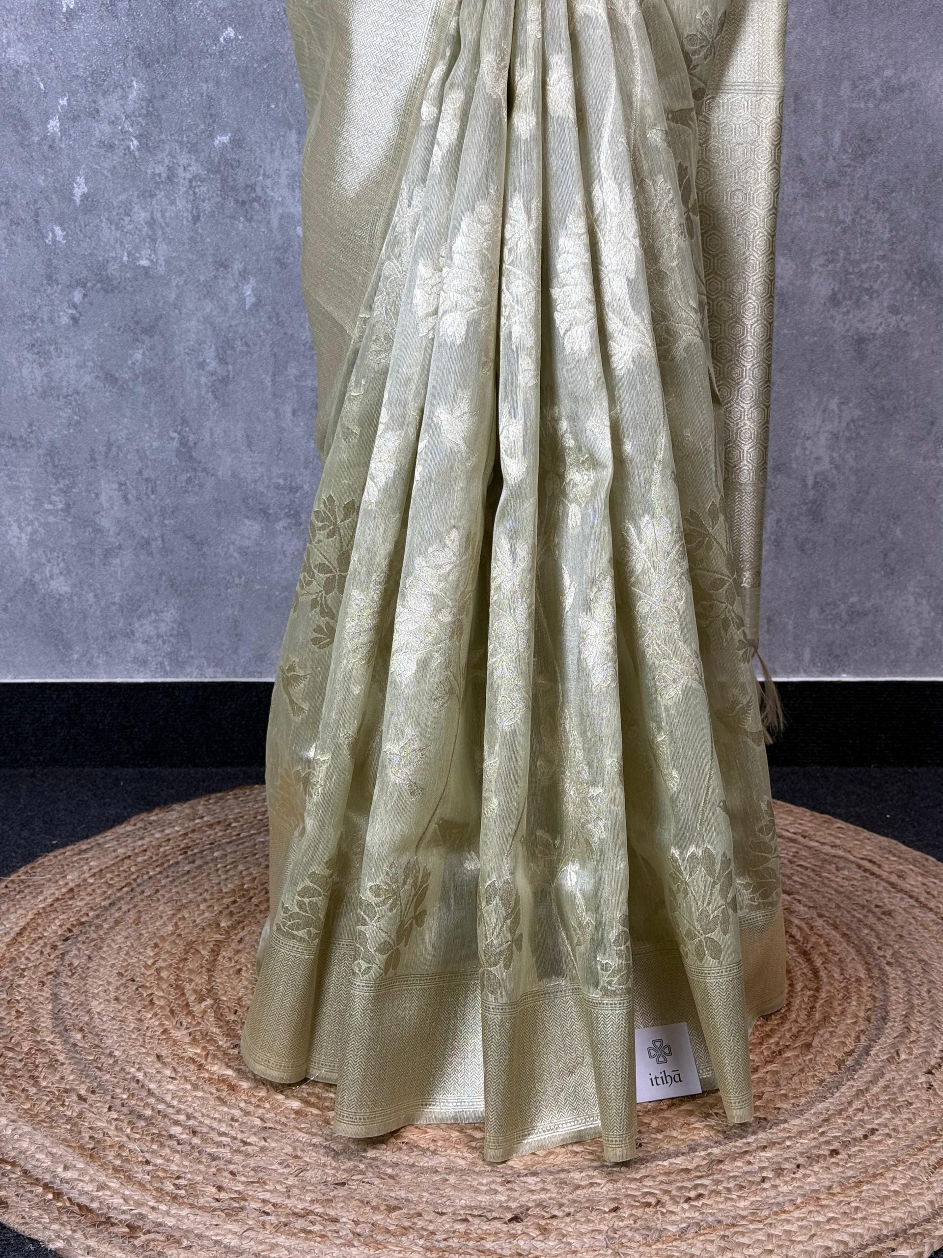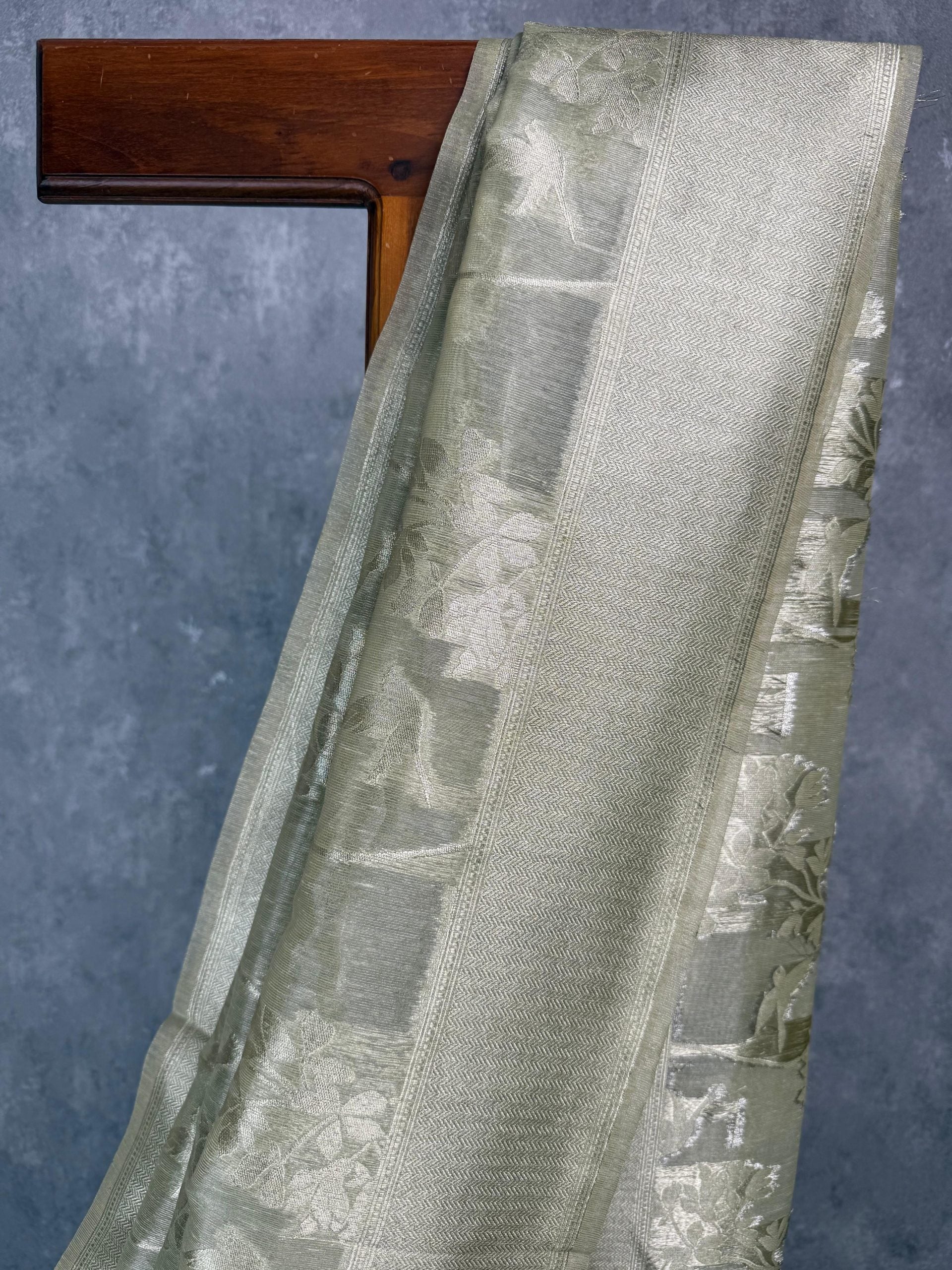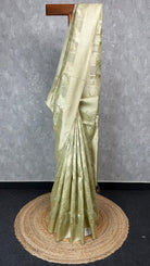 This elegant tissue silk Banarasi saree features a subtle light green tone with intricate floral brocade weaving throughout the body. The saree comes with attached blouse piece.