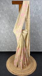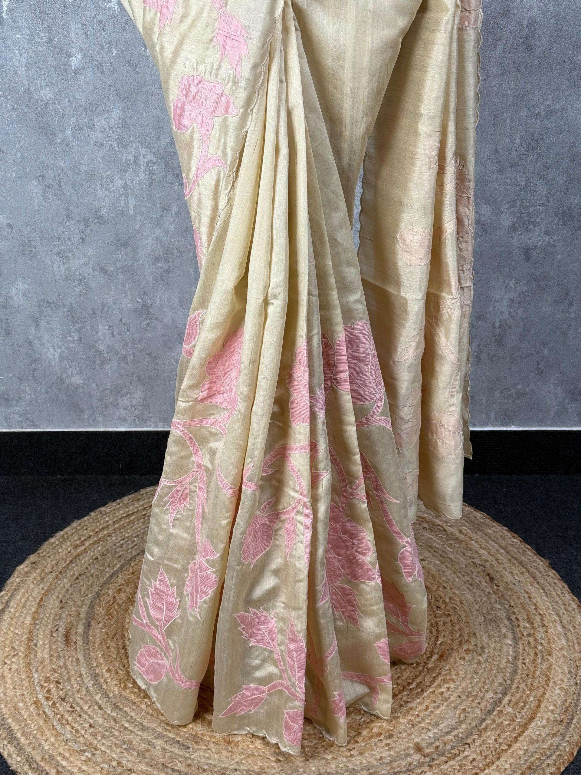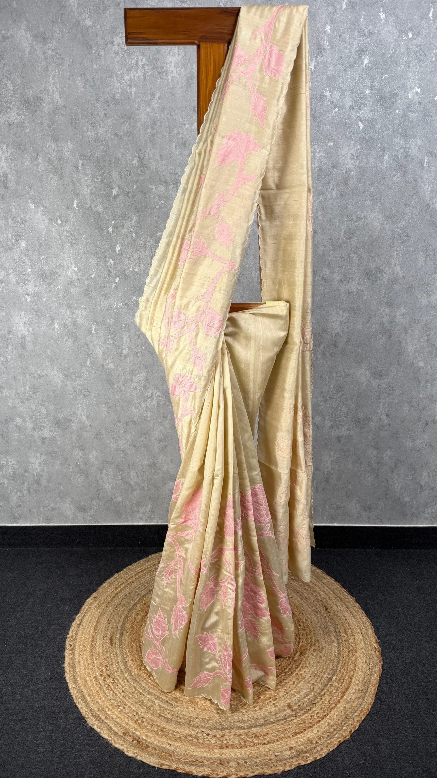 This semi Tussar appliqué embroidery saree is a stunning piece of traditional Indian attire. The saree features a beige base colour with intricate pink floral embroidery along the border, adding a touch of elegance to its overall design. The scalloped edges of the saree further enhance its beauty, making it a perfect choice for formal occasions. The combination of beige and pink creates a harmonious contrast that is both visually appealing and sophisticated. The saree comes with attached blouse piece.