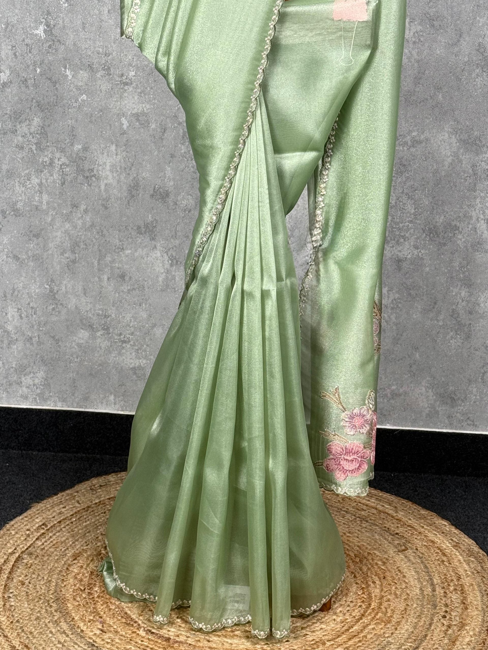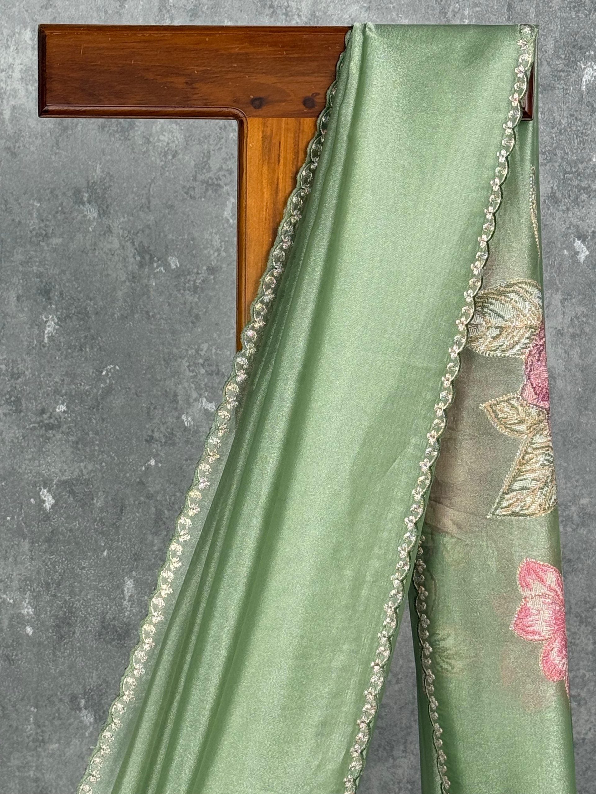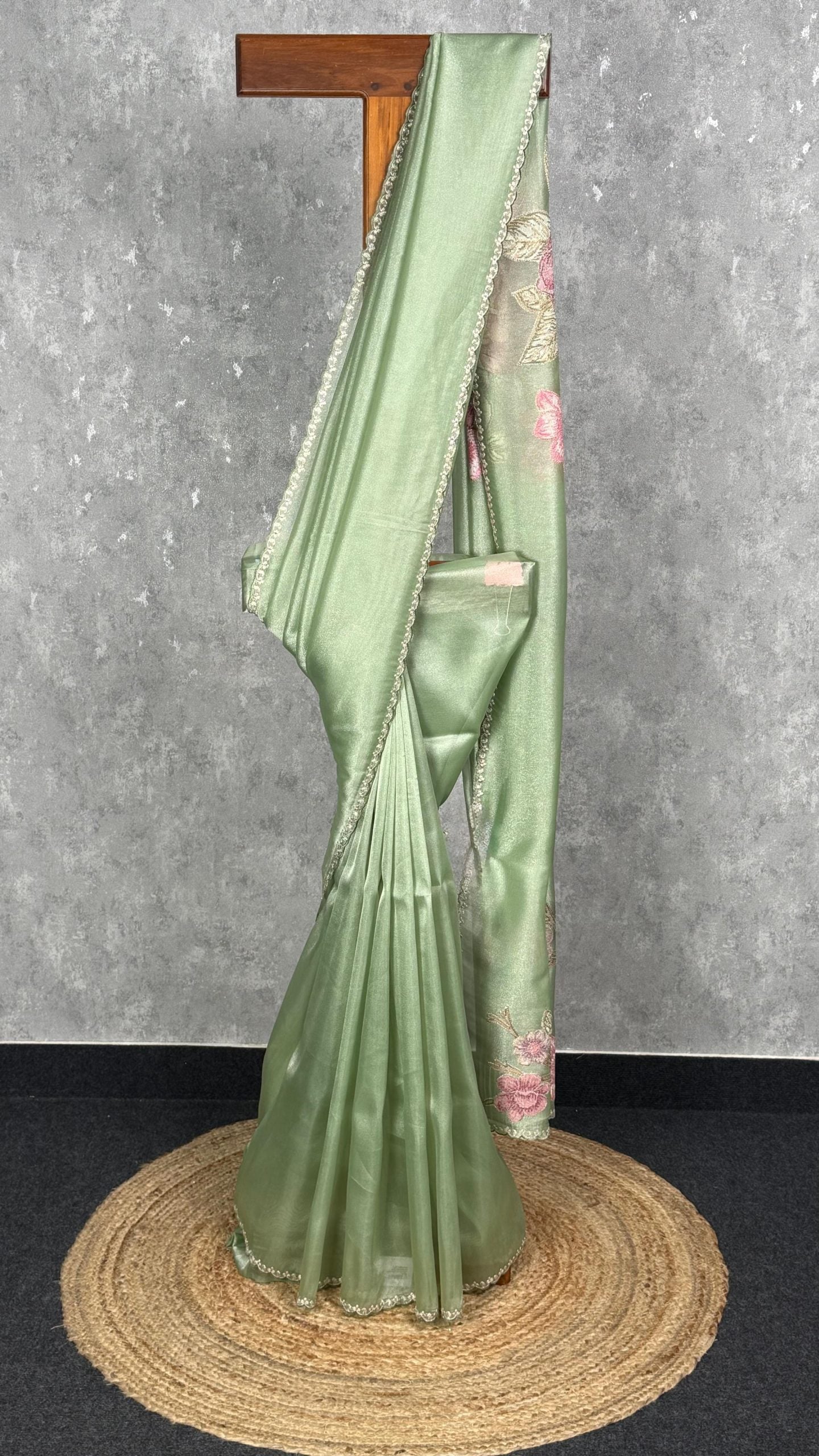 This saree features a soothing pastel pistachio green shade that exudes grace and freshness. The subtle sheen of the fabric combined with delicate embroidered detailing along the border adds a refined and elegant charm. Perfect for festive occasions and celebrations, it offers a soft yet sophisticated look.