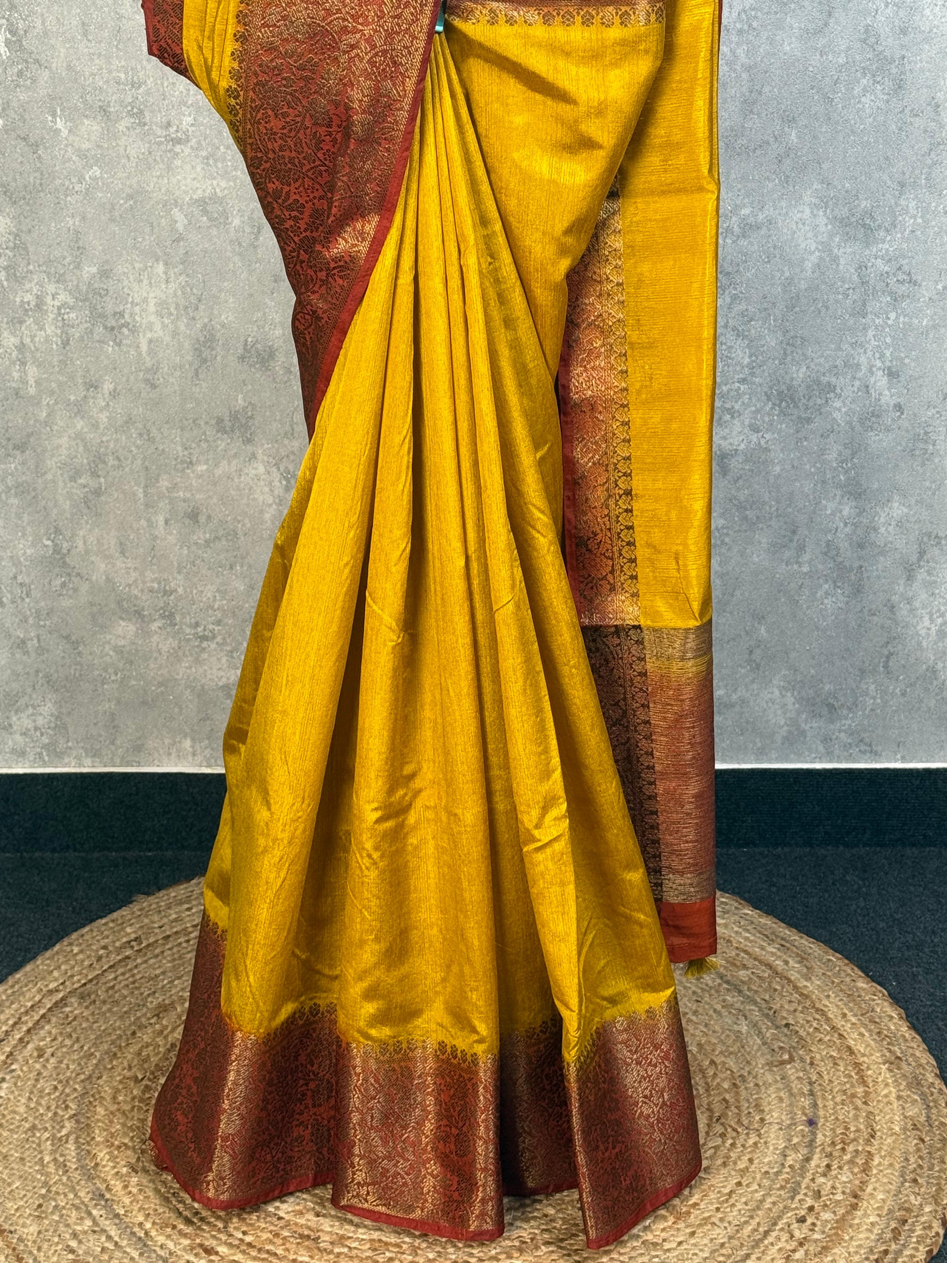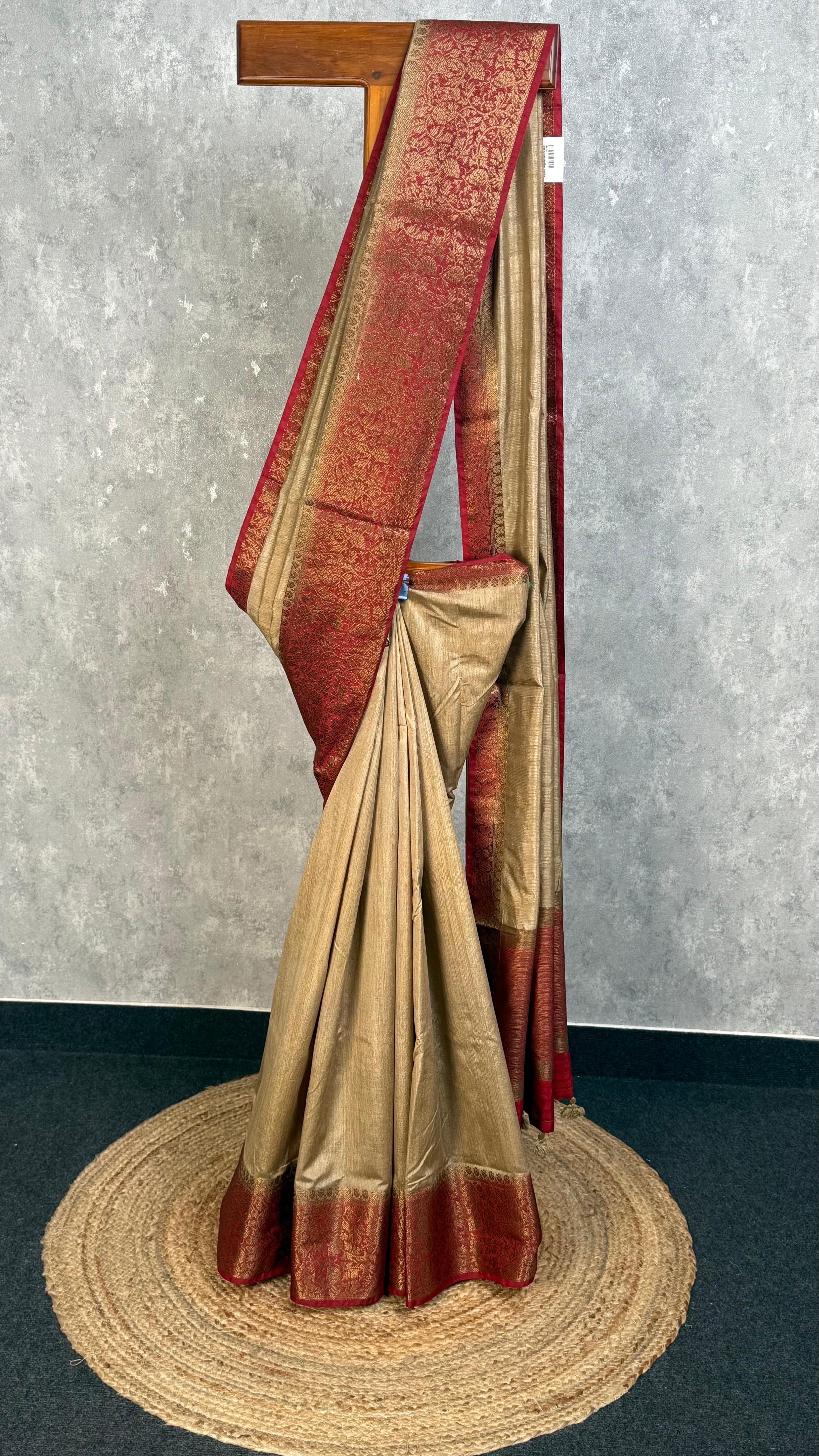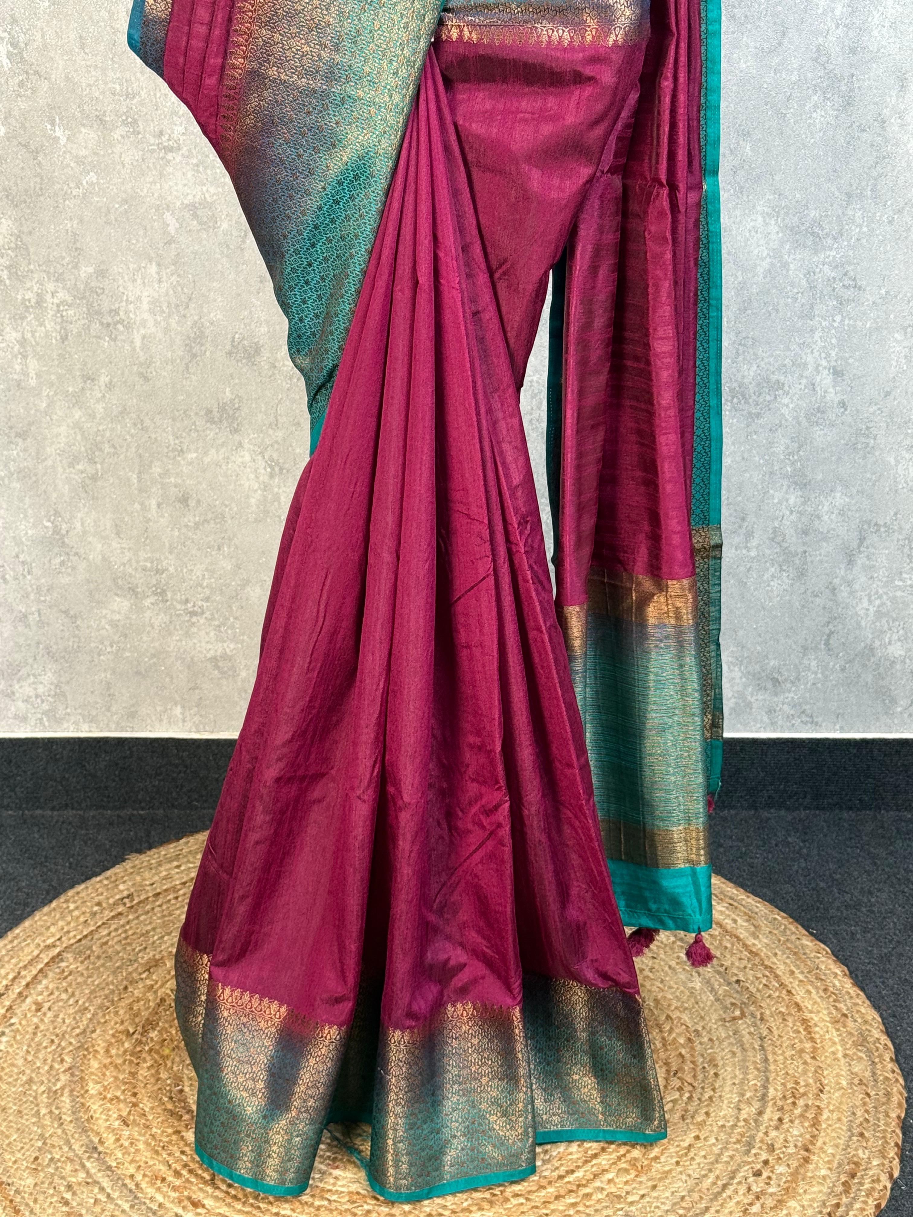 Experience the timeless elegance of this Semi Tussar Weaving Contra Banarasi Saree, where traditional craftsmanship meets sophisticated design. This saree blends the lustrous texture of tussar silk with classic Banarasi weaving techniques, creating a piece that's both comfortable to wear and striking to look at. Perfect for celebrations and special occasions, it brings together heritage artistry with modern style.