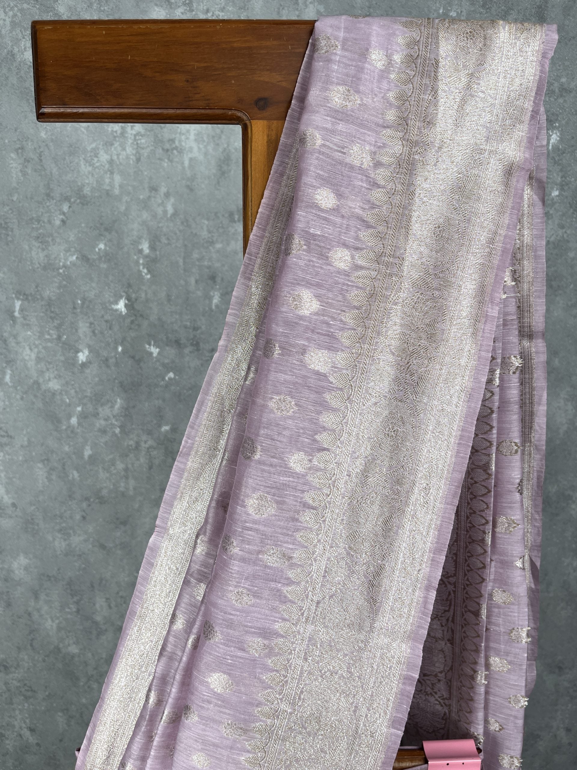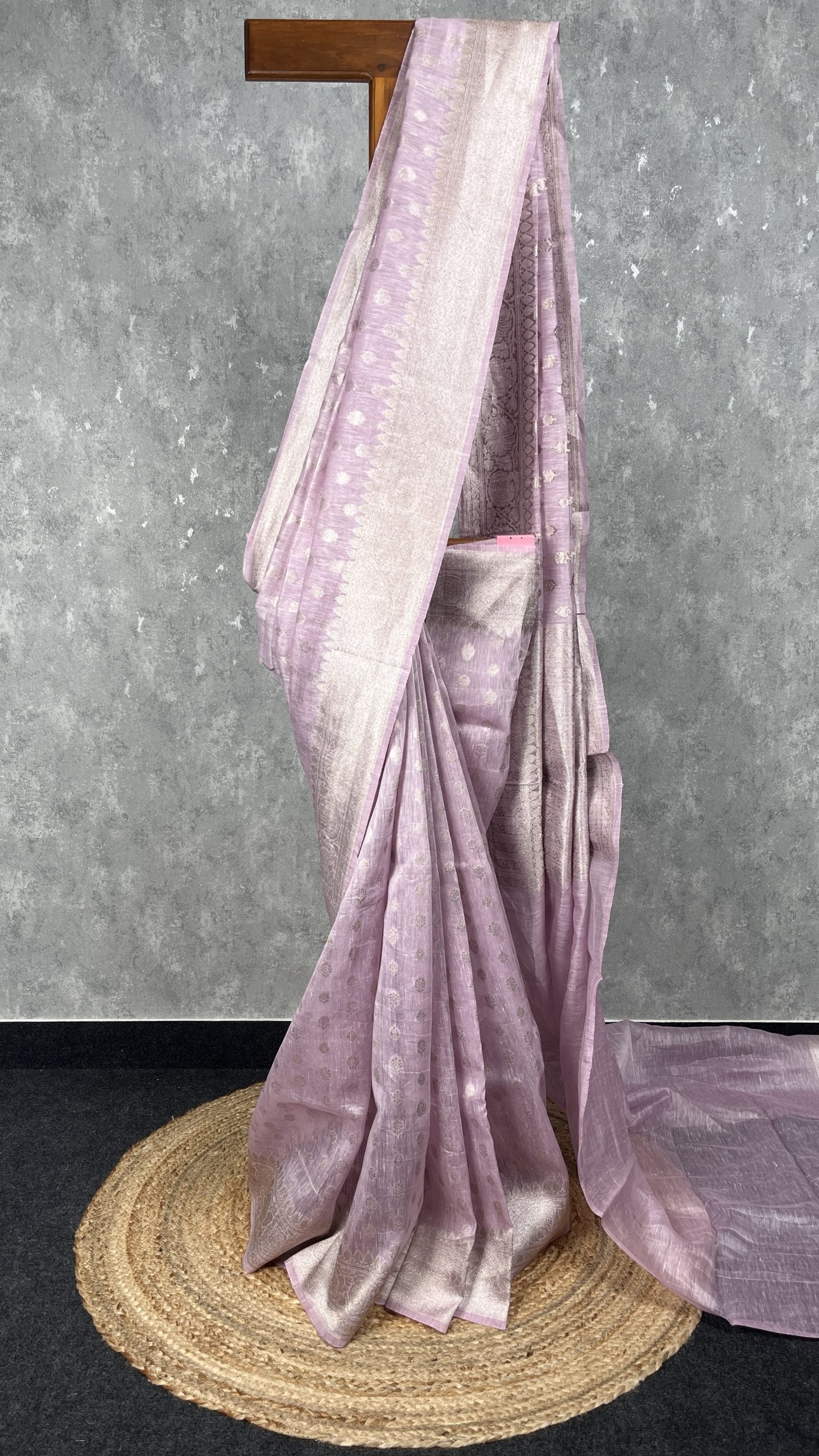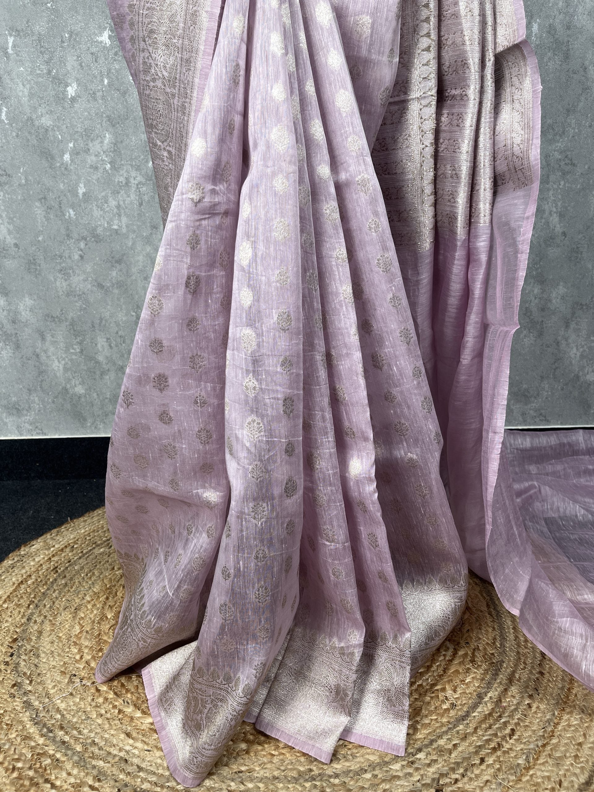Pure silk linen banarasi saree with silver zari weave. The saree has bhutas woven all over the body and traditional banarasi woven borders. Silk linen fabric is very breathable light weight and easy to drape.The saree comes with attached self color blouse piece.