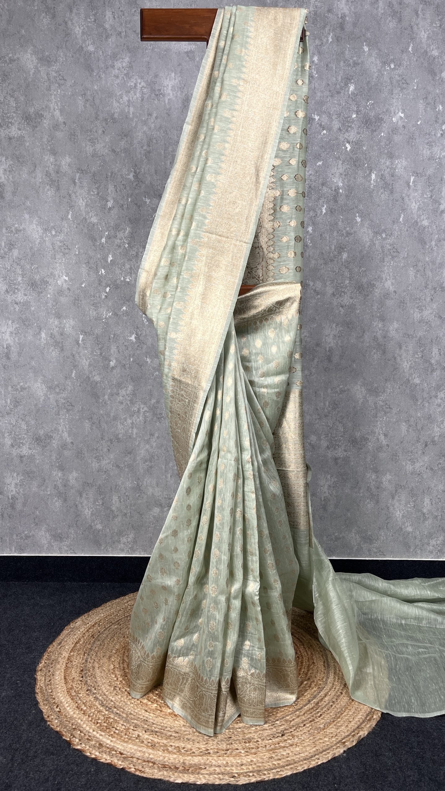 Pure silk linen banarasi saree with light gold zari weave. The saree has bhutas woven all over the body and traditional banarasi woven borders. Silk linen fabric is very breathable light weight and easy to drape.The saree comes with attached self color blouse piece.