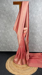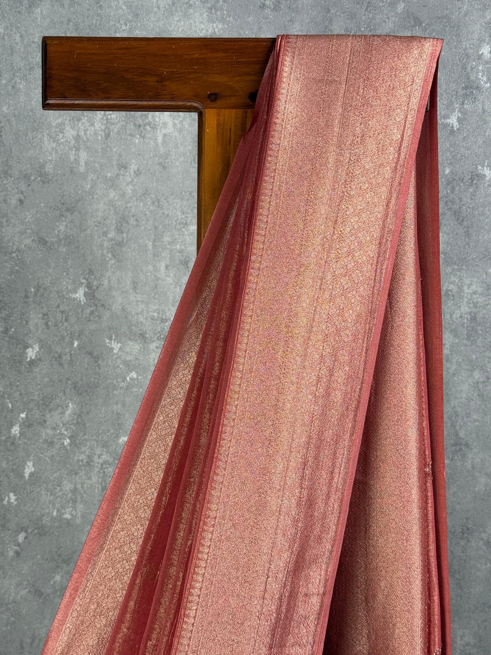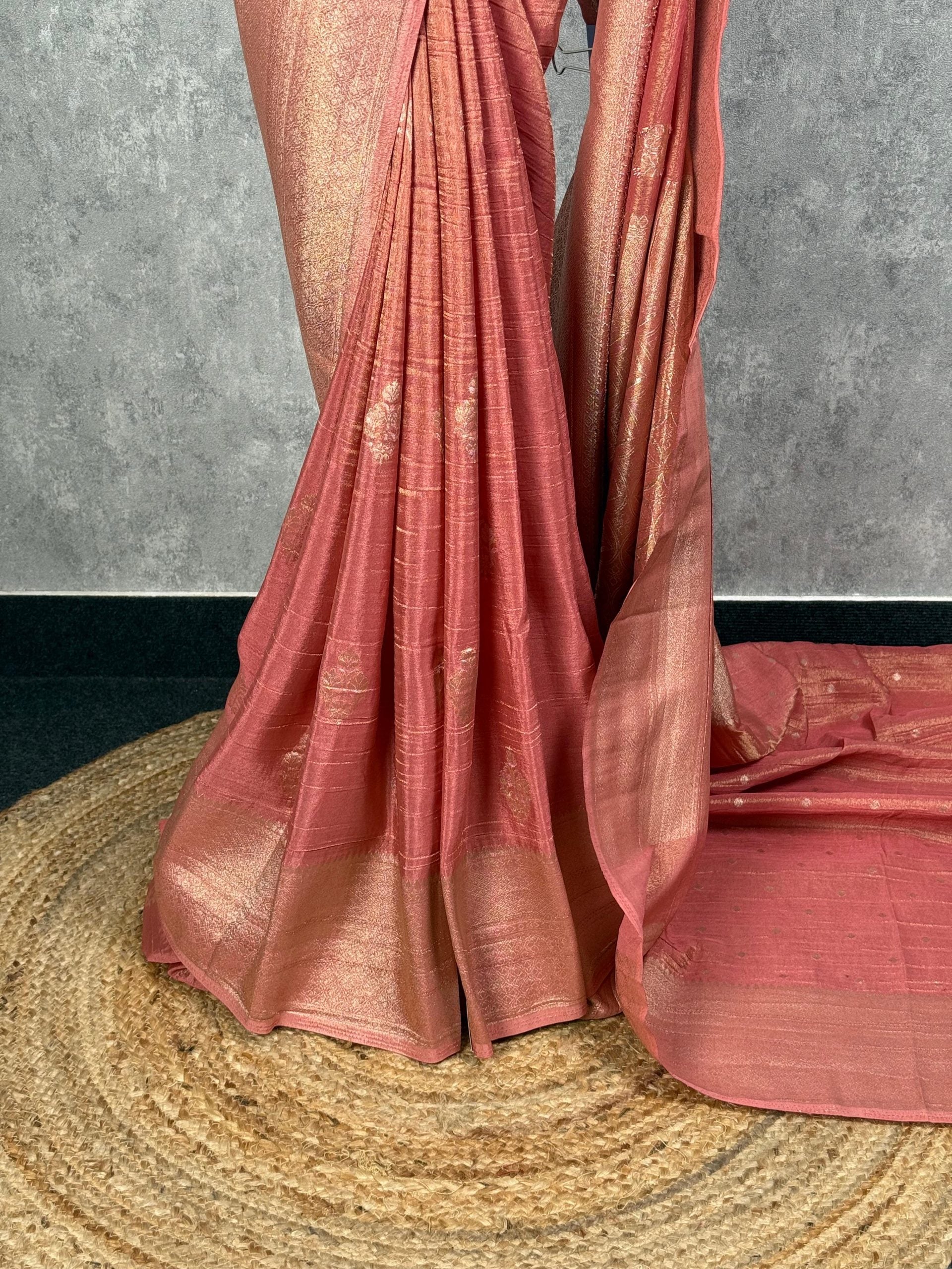 This crushed tissue silk Banarasi saree is in a vibrant peach colour with a shimmery texture. The saree features intricate patterns woven with golden accents, adding a touch of elegance. The fabric has a crushed tissue effect giving it a unique texture. The saree showcases traditional Banarasi craftsmanship with its rich patterns and colour. The saree comes with attached self color blouse piece.