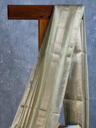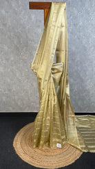 This semi tissue organza Banarasi saree features a light yellow colour with gold stripes and patterns throughout the fabric. The saree has a subtle yet elegant design with gold accents adding a touch of sophistication. The semi tissue organza material gives the saree a lightweight and airy feel. The saree showcases traditional Banarasi craftsmanship with its intricate gold patterns.The saree comes with attached self color blouse piece.