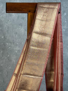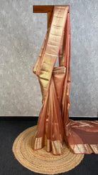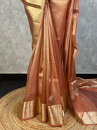 This semi tissue organza Banarasi saree features a golden peach colour with gold stripes and patterns throughout the fabric. The saree has a subtle yet elegant design with gold accents adding a touch of sophistication. The semi tissue organza material gives the saree a lightweight and airy feel. The saree showcases traditional Banarasi craftsmanship with its intricate gold patterns.The saree comes with attached self color blouse piece.