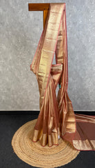This semi tissue organza Banarasi saree features a golden peach colour with gold stripes and patterns throughout the fabric. The saree has a subtle yet elegant design with gold accents adding a touch of sophistication. The semi tissue organza material gives the saree a lightweight and airy feel. The saree showcases traditional Banarasi craftsmanship with its intricate gold patterns.The saree comes with attached self color blouse piece.