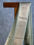 This semi tissue organza Banarasi saree features a light green colour with gold stripes and patterns throughout the fabric. The saree has a subtle yet elegant design with gold accents adding a touch of sophistication. The semi tissue organza material gives the saree a lightweight and airy feel. The saree showcases traditional Banarasi craftsmanship with its intricate gold patterns.The saree comes with attached self color blouse piece.