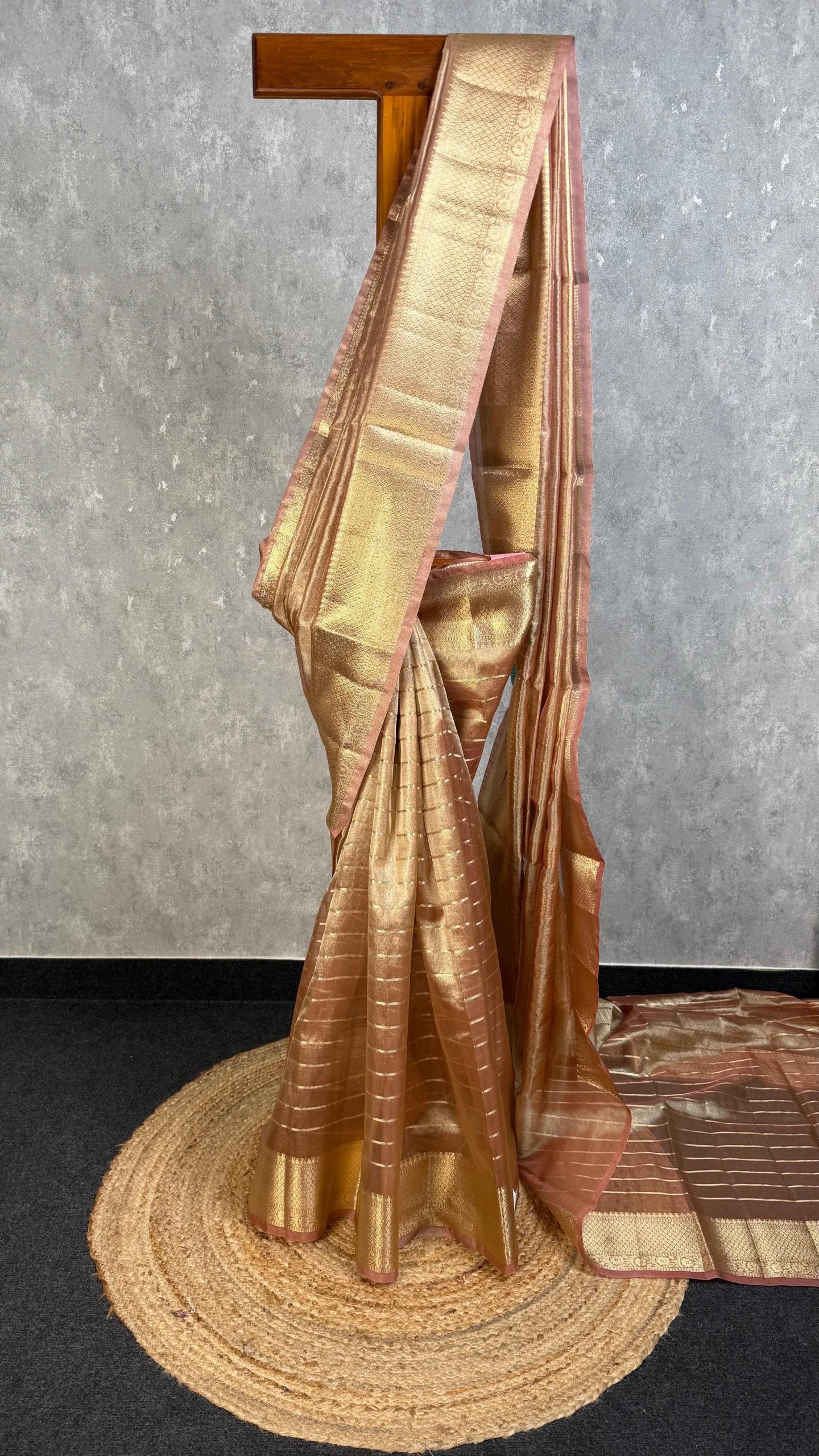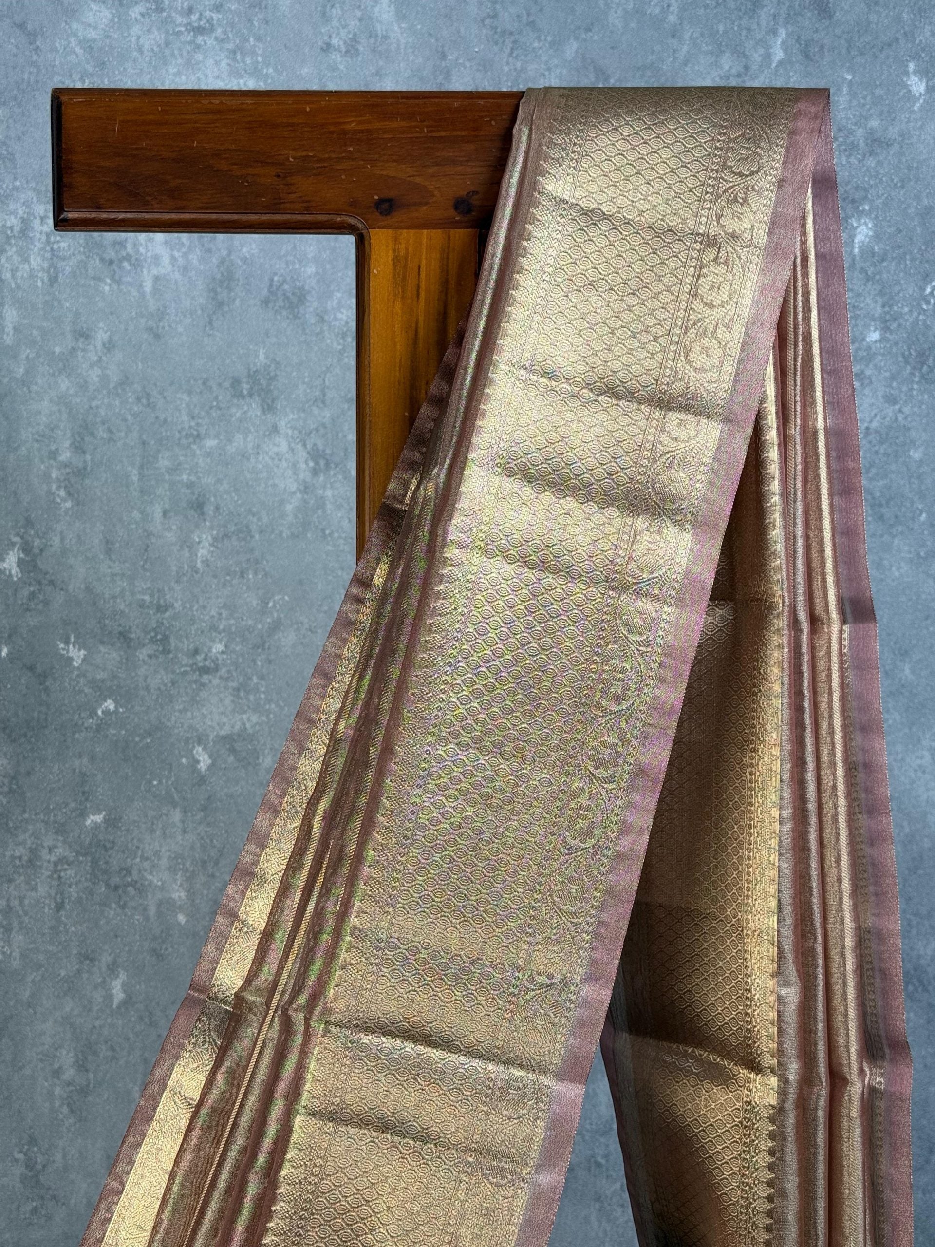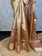 This semi tissue organza Banarasi saree features a beautiful peach and gold colour combination. The saree has a subtle grid pattern with gold zari stripes and a gold zari border. The saree showcases intricate zari work, adding to its elegance. The overall design gives the saree a rich and sophisticated look.The saree comes with attached self color blouse piece.