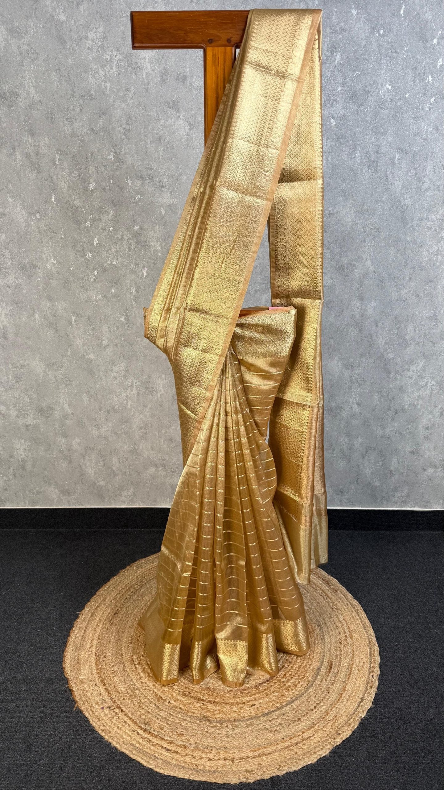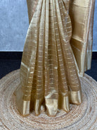 This semi tissue organza Banarasi saree features a beautiful golden colour. The saree has a subtle grid pattern with gold zari stripes and a gold zari border. The saree showcases intricate zari work, adding to its elegance. The overall design gives the saree a rich and sophisticated look.The saree comes with attached self color blouse piece.