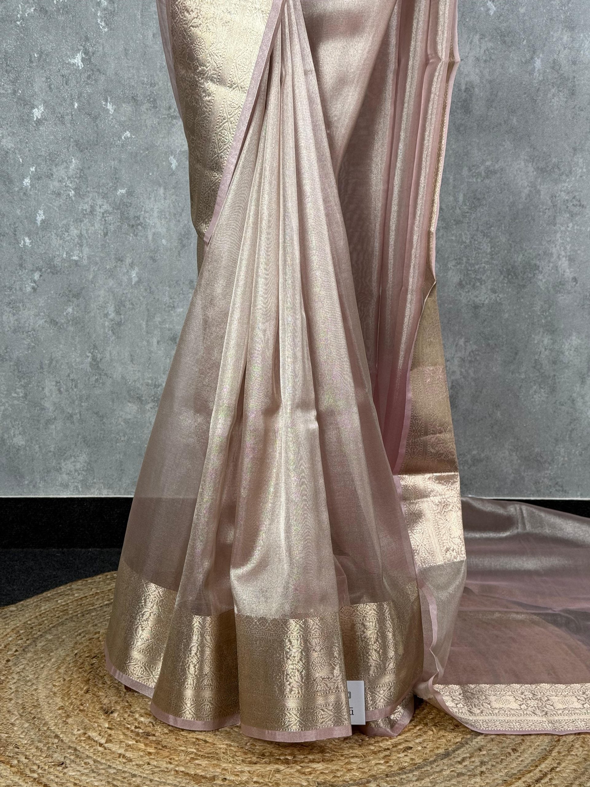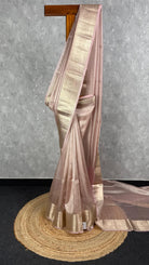 This semi tissue organza Banarasi saree features a golden lilac colour with gold stripes and patterns throughout the fabric. The saree has a subtle yet elegant design with gold accents adding a touch of sophistication. The semi tissue organza material gives the saree a lightweight and airy feel. The saree showcases traditional Banarasi craftsmanship with its intricate gold patterns.The saree comes with attached self color blouse piece.