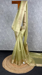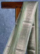 This semi tissue organza Banarasi saree features a light green colour with gold stripes and patterns throughout the fabric. The saree has a subtle yet elegant design with gold accents adding a touch of sophistication. The semi tissue organza material gives the saree a lightweight and airy feel. The saree showcases traditional Banarasi craftsmanship with its intricate gold patterns.The saree comes with attached self color blouse piece.
