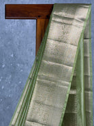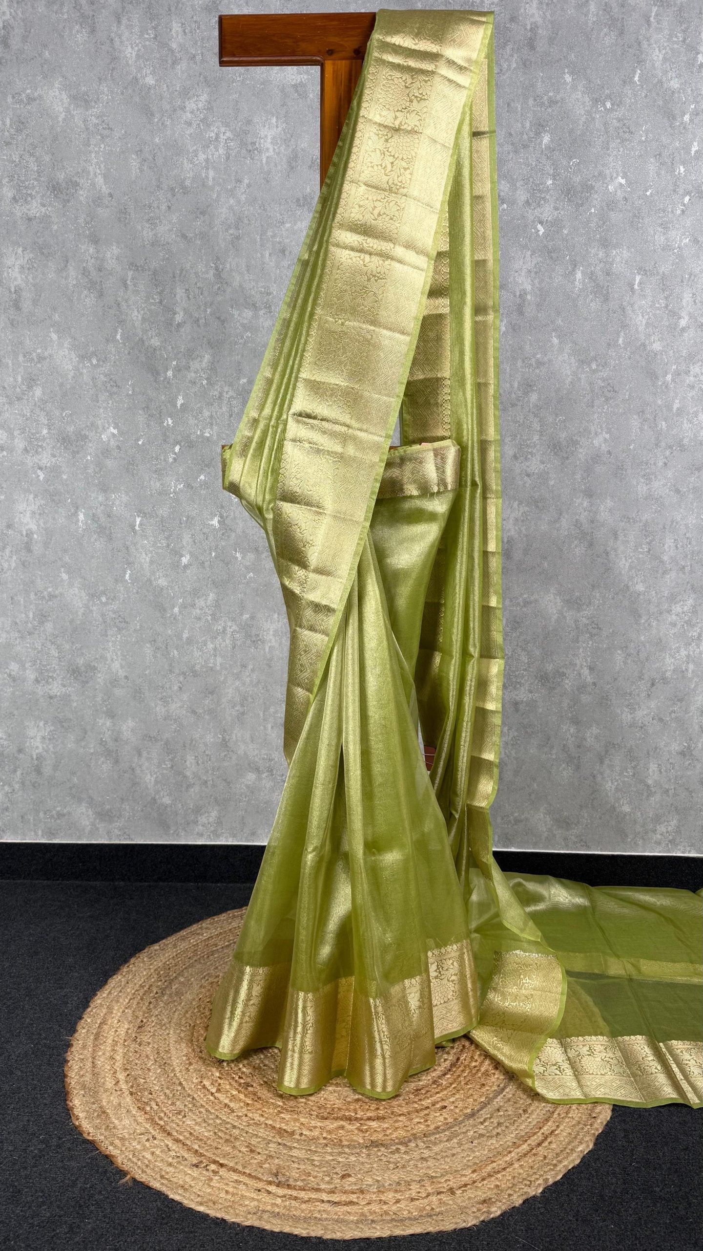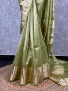This semi tissue organza Banarasi saree features a green colour with gold stripes and patterns throughout the fabric. The saree has a subtle yet elegant design with gold accents adding a touch of sophistication. The semi tissue organza material gives the saree a lightweight and airy feel. The saree showcases traditional Banarasi craftsmanship with its intricate gold patterns.The saree comes with attached self color blouse piece.