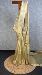 This semi tissue organza Banarasi saree features a beautiful golden green colour with intricate gold patterns. The saree has a gold border with detailed designs along the edges. The fabric showcases a blend of semi-tissue organza texture with traditional Banarasi weaving. The saree is adorned with gold accents that add to its elegance.The saree comes with attached self color blouse piece.