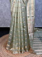 This semi tissue organza Banarasi saree features a light green colour with gold stripes and patterns throughout the fabric. The saree has a subtle yet elegant design with gold accents adding a touch of sophistication. The semi tissue organza material gives the saree a lightweight and airy feel. The saree showcases traditional Banarasi craftsmanship with its intricate gold patterns.The saree comes with attached self color blouse piece.