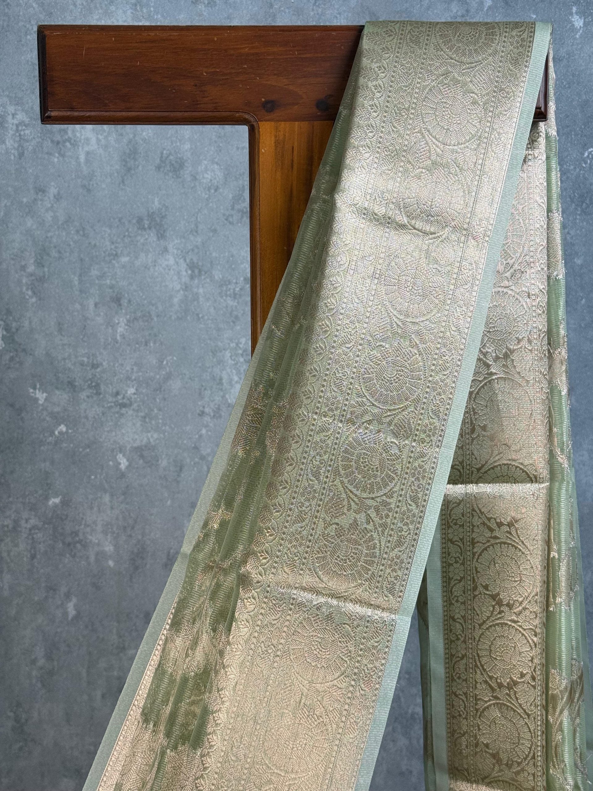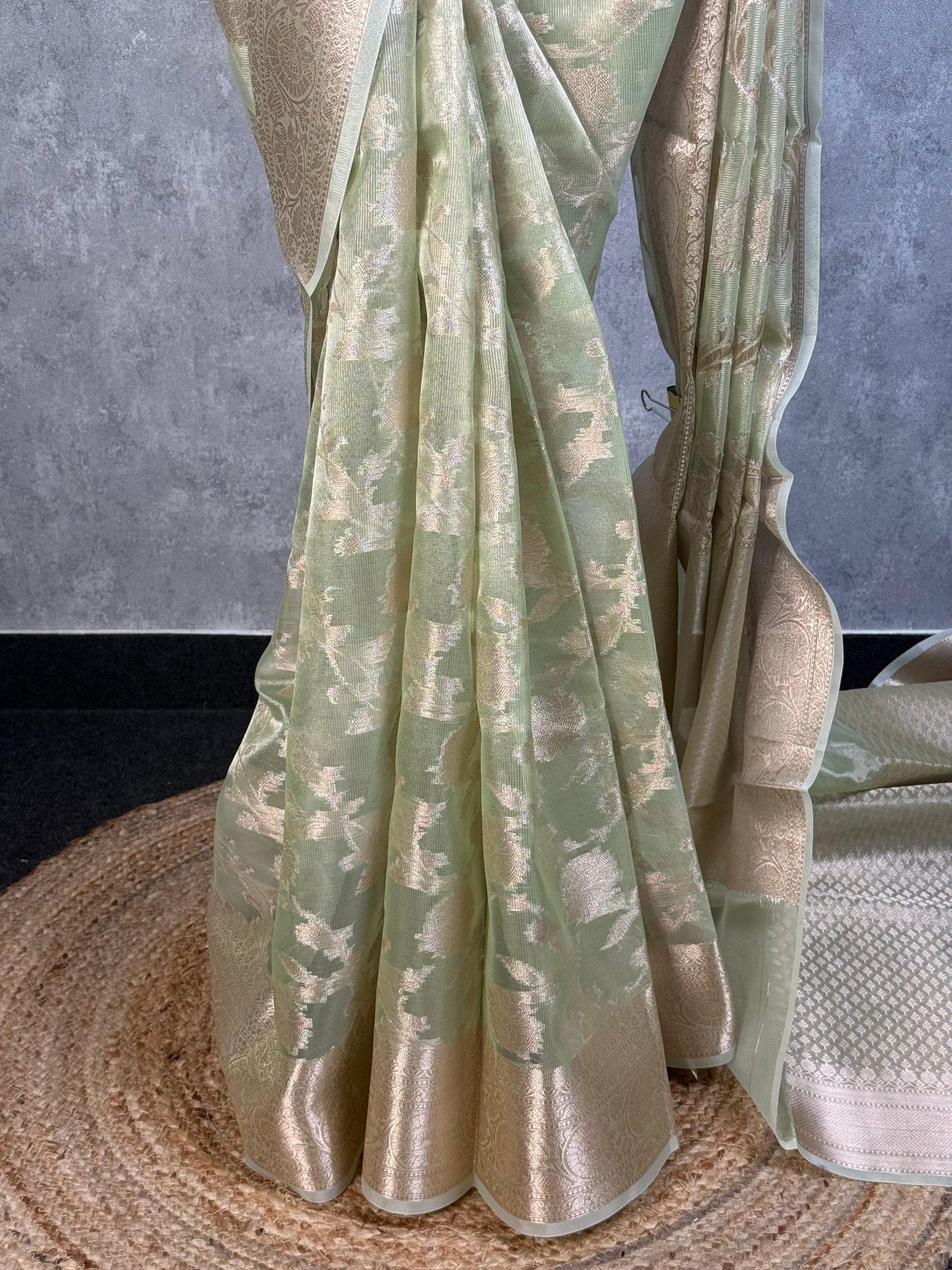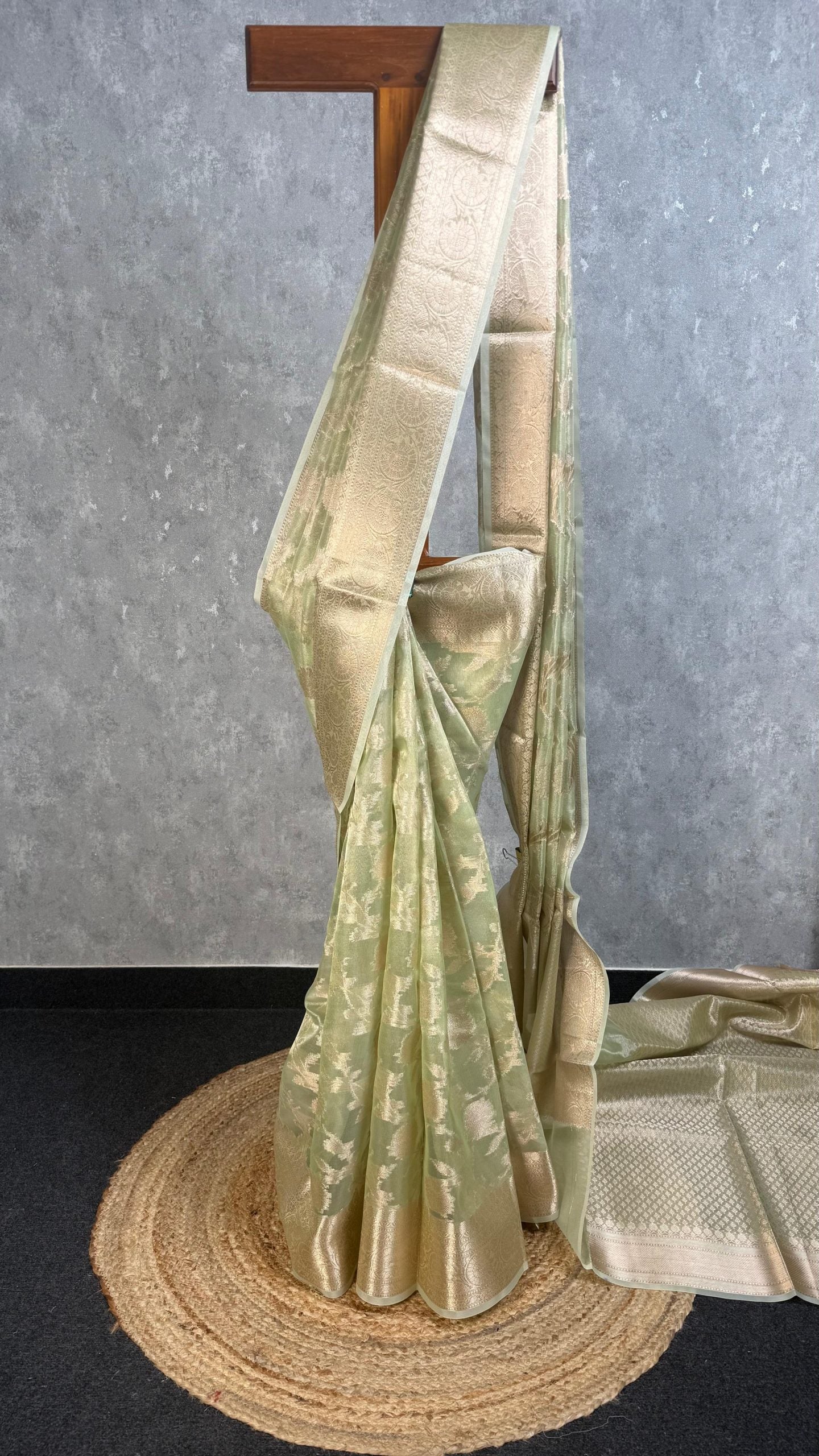 This semi tissue organza Jaal Banarasi saree features a light green colour with intricate gold patterns woven throughout. The saree has a gold border that adds to its elegance. The fabric showcases a jaal pattern, characteristic of Banarasi sarees, with delicate gold motifs. The saree is complemented by a matching gold-pattered piece, likely the pallu.The saree comes with attached self color blouse piece.
