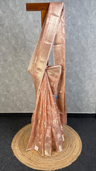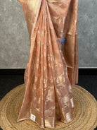 This semi tissue organza Jaal Banarasi saree features a peach colour with intricate gold zari patterns throughout. The saree has a gold border that adds a touch of elegance. The fabric showcases a beautiful Jaal pattern with gold accents. The saree is adorned with gold zari work, giving it a luxurious look.The saree comes with attached self color blouse piece.