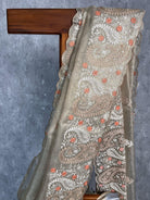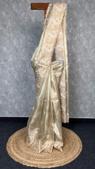 Tissue kota saree with beautiful thread embroidery all over the body and multicolored floral embroidery along the border. The has attached tissue kota fabric with embroidery along the sleeve edges.